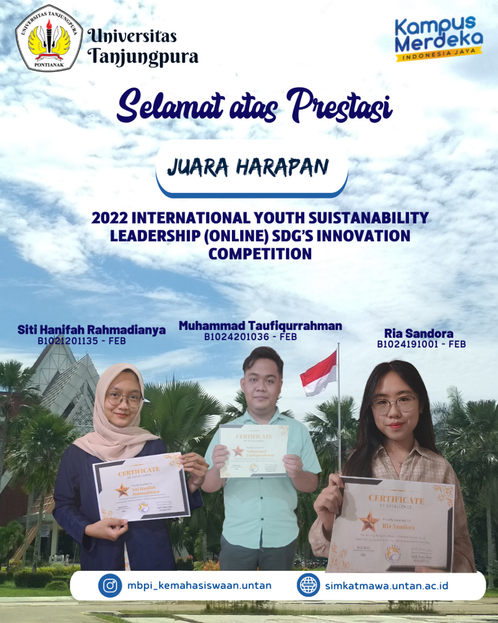 Satu diantara universitas yang berpartisipasi dalam perlombaan tersebut adalah Universitas Tanjungpura dengan mengirimkan 3 tim untuk mengikuti proses seleksi proposal hingga terpililih salah satu team yang merupakan mahasiswa/i dari Fakultas Ekonomi dan Bisnis.Tim tersebut terdiri dari Muhammad Taufiqurrahman, Ria Sandora, serta Siti Hanifah Rahmadianya yang hadir dengan ide bisnis bernama “Pi Feed”. 2022 International Youth Sustainability Leadership (IYSL) Online ⎼ SDGs Innovation Competition dilaksanakan secara daring melalui platform “Google Meet” pada tanggal 5 Oktober 2022. Pi Feed berhasil meraih Rising Star (Juara Harapan) dengan inovasi pakan ternak dengan memberdayakan sampah nanas sebagai bahan dasar pembuatan pakan.