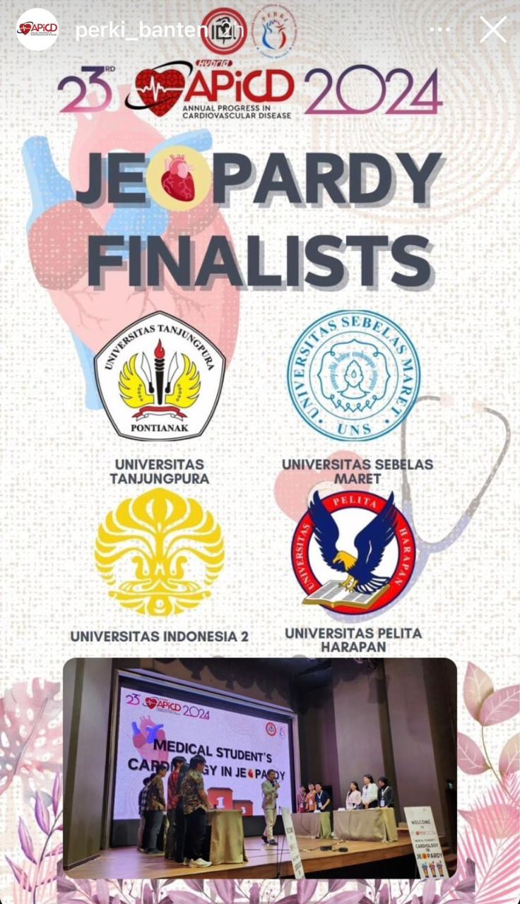 Kegiatan APiCD (Annual Progress in Cardiovascular Disease) yang ke-23 di ikuti oleh 18 perguruan Tinggi di seluruh Indonesia , Perguruan Tinggi diantaranya adalah Universitas Indonesia, Universitas Tanjungpura, UNS (Universitas Sebelas Maret), Universitas Pertahanan, UIN Syarief Hidayatullah Jakarta, UNTIRTA (Universitas Sultan Ageng Tirtayasa), UPNVJ (Universitas Pembangunan Nasional Veteran Jakarta), UNSRAT, Universitas Lambung mangkurat, dan Universitas Soedirman. Jumlah peserta yang ikut berkompetisi adalah 54 peserta. Universitas Tanjungpura diwakili oleh Joan Carmen Harianto, S.Ked, Happyana Sari, S.Ked dan Prisma Annisa, S.Ked dari Prodi Profesi Dokter,