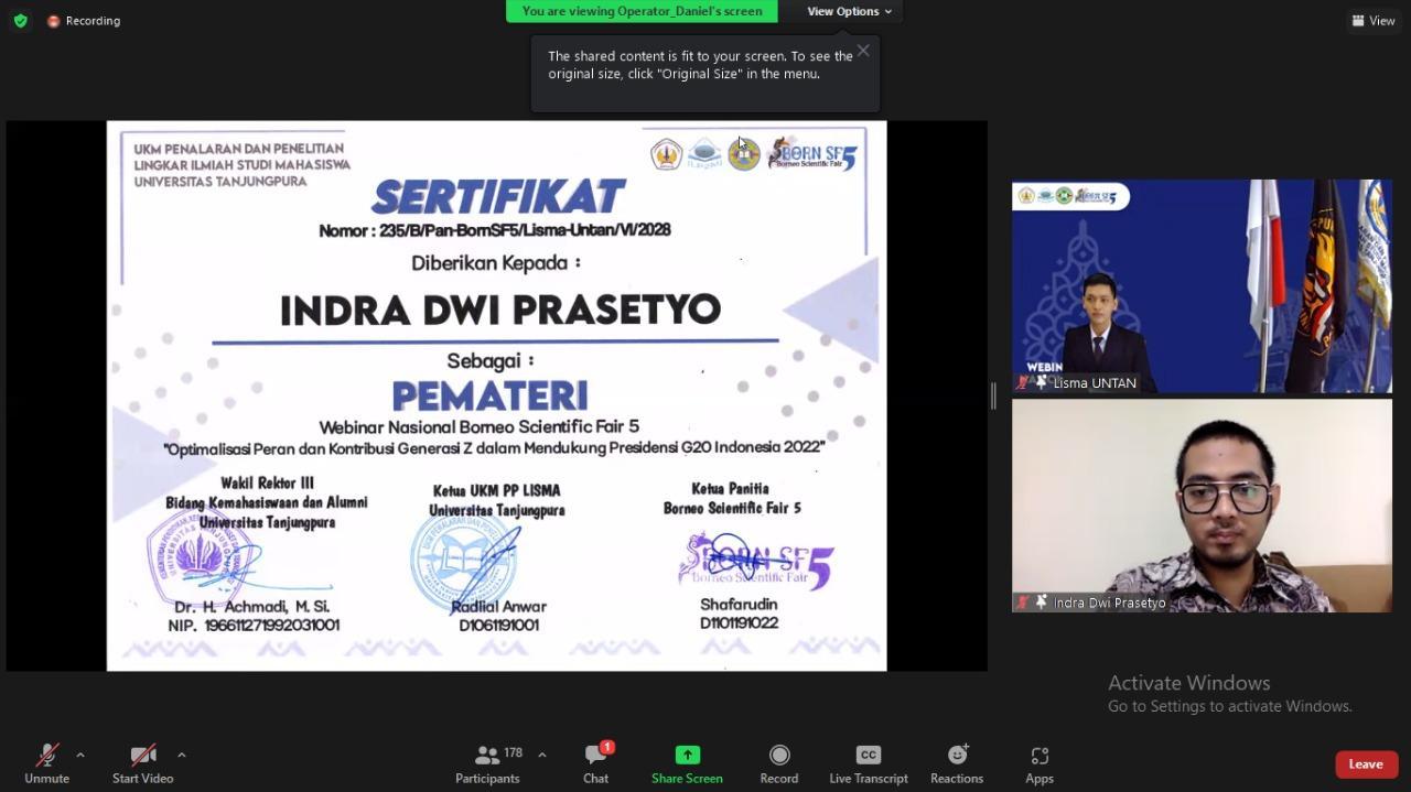Borneo Scientific Fair (Born SF) 5 merupakan kegiatan webinar yang diselenggarakan oleh UKM PP LISMA UNTAN pada Minggu, 19 Juni 2022. Kegiatan Webinar ini diadakan secara daring via Zoom Meeting dengan mengangkat tema “Optimalisasi Peran dan Kontribusi Generasi Z dalam Mendukung Presidensi G20 Indonesia 2022”.Pemateri webinar nasional ini terdiri dari 2 orang yaitu Indra Dwi Prasetyo, yaitu seorang Co-chairs Y20 Indonesia 2022 dan Aldi Fauzan Akbar, yaitu Delegasi Pre-Summit 3 Y20 Indonesia 2022 dan juga seorang Co-Founder of YOUNGSEA serta dipandu oleh Arief Fadhilah. Total peserta yang mengikuti webinar nasional tersebut berjumlah 275 peserta. Benefit yang didapatkan oleh para peserta WebInar Nasional tersebut yaitu ilmu bagi peserta untuk dapat memberikan kontribusi dan peran dalam mendukung Presidensi G20 Indonesia 2022, peserta juga mendapatkan sertifikat serta doorprize yang menarik.