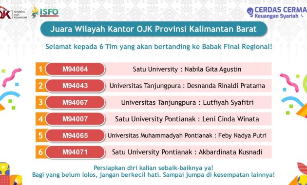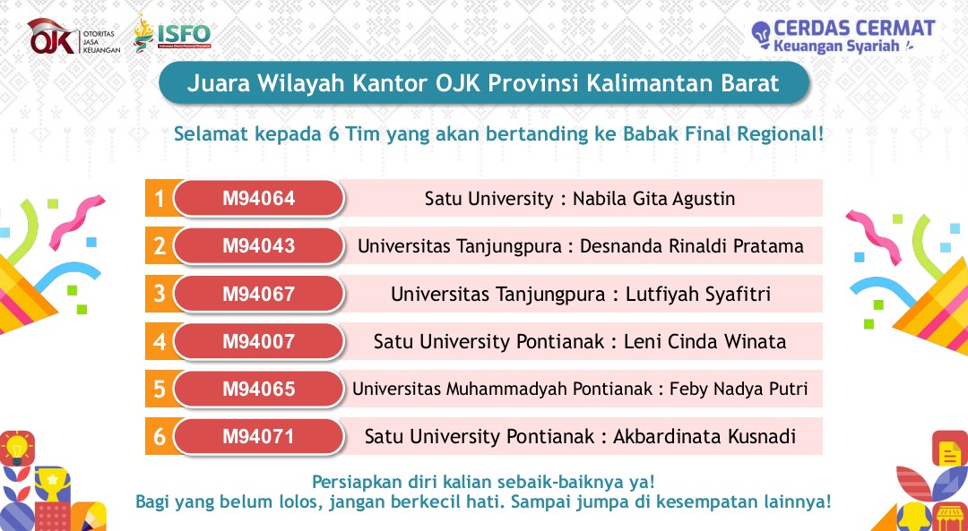 Cerdas Cermat Keuangan Syariah merupakan rangkaian perlombaan dari Indonesia Sharia Financial Olympiad (ISFO) 2025 yang diselenggarakan oleh Otoritas Jasa Keuangan Republik Indonesia. Perlombaan ini merupakan cerdas cermat mengenai keuangan syariah, sektor keuangan, dan pengetahuan terkait OJK. Diselenggarakan dari tanggal 11 Oktober 2025 hingga 04 November 2025. Dimulai dari babak penyisihan wilayah yang diselenggarakan secara daring pada 11 Oktober 2025 dengan mempertandingkan 9 tim dari Provinsi Kalimantan Barat. 6 tim teratas akan mewakili provinsi Kalimantan Barat menuju babak Final Regional sebelum bisa bertanding di babak Grand Final di Surabaya. Tim Universitas Tanjungpura yang terdiri dari Desnanda Rinaldi Pratama, Esania Lailia Fitri, dan Luvi Yulianto meraih Juara 2 di tingkat Provinsi Kalimantan Barat dan berhak mewakili provinsi Kalimantan Barat di babak Final Regional.