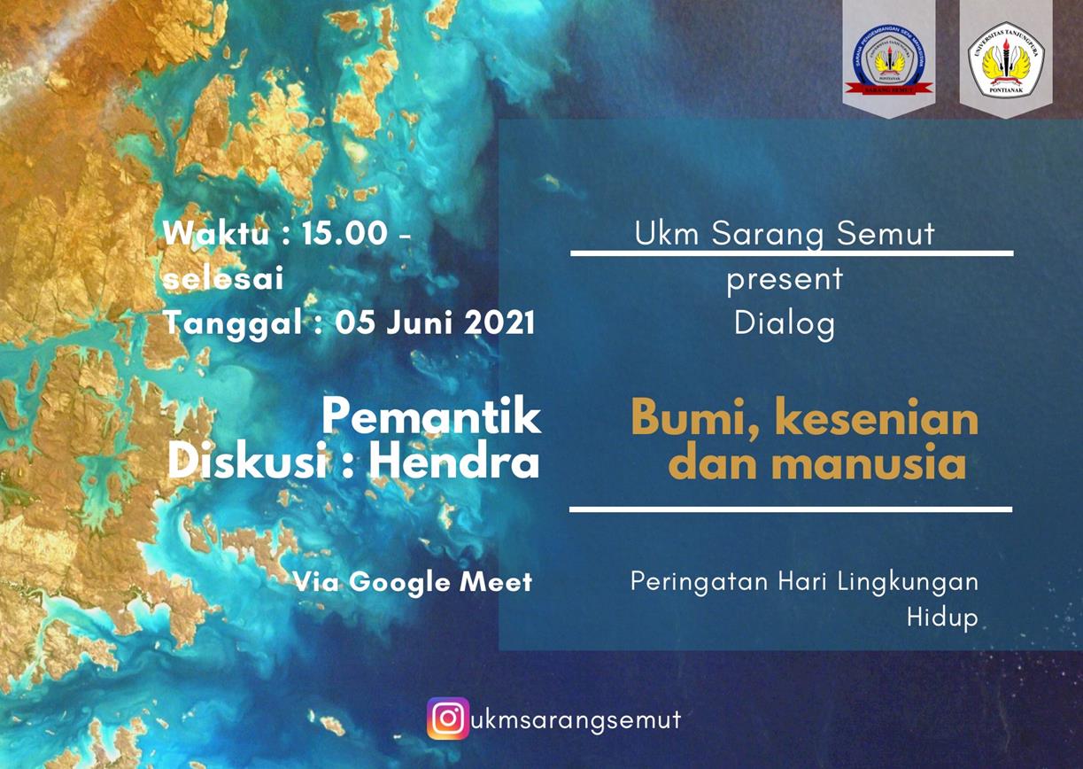 Kegiatan dialog dalam rangka peringatan hari lingkungan hidup dilaksanakan selama satu hari dilakukan oleh anggota bersama narasumber melalui Google Meet. Kegiatan dialog memiliki tujuan memberikan persepi baru dalam ruang lingkup hubungan manusia dan lingkungannya. Dengan capaian melalui tema bumi, kesenian dan manusia anggota UKM Sarang Semut mendapatkan perspektif baru dan sepakat bahwa relasi antar ketiganya adalah utuh dan merupakan kebijaksanaan jika berjalan beriringan dengan saling bahu membahu untuk peradaban. Kegiatan ini dilaksanakan pada tanggal 5 Juni 2021, kegiatan dilaksanakan secara daring memandang kondisi yang masih belum efektif untuk berkegiatan secara luring. Melalui kegiatan ini diharapkan anggota dapat merefleksikan makna dalam memelihara relasi antar manusia dan peradabannya. Lingkungan adalah salah satu faktor dalam keberlangsungan hidup, jika relasi tidak selaras akibatnya dapat dirasakan dalam ruang dan waktu yang sempit.