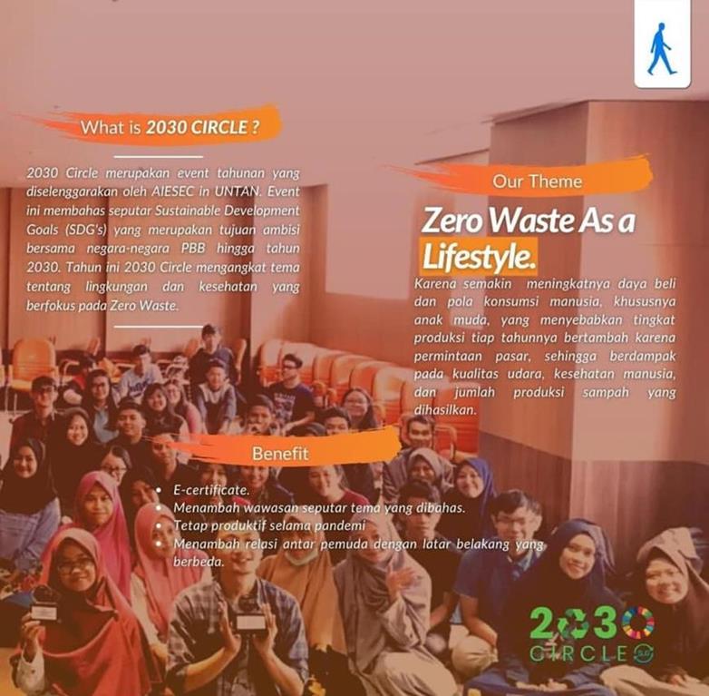 Event Nasional 2030 Cirle in Universitas Tanjungpura “Zero Waste as a Lifestyle” salah satu kegiatan tahunan yang diadakan oleh AIESEC in UNTAN yang membahas seputar sustainable development goals. 2030 circle kali ini mengankat tema Zero Waste As a lifestyle karena semakin meningkatnya daya beli dan pola konsumsi manusia yang menyebabkan tingkat produksi tiap tahunnya bertambah, sehingga berdampak pada kualitas udara, kesehatan manusia, dan jumlah produksi sampah yang meningkat. Event Nasional 2030 Circle yang diselenggarkan pada tanggal 17 Oktober 2020 via Zoom Meeting mengangkat tema tentang lingkungan dan kesehatan yang berfokus pada Zero Waste As a Lifestyle dengan SDGs #15 Life on Land. Event ini dibagi menjadi 3 sesi yaitu Webinar Session yang dimoderatori Muhammad Regi Sofyan sebagai Chief of Earth Hour Pontianak dengan 2 orang pembicara yaitu Cinthia Kusuma Rani sebagai Miss Earth Indonesia 2019 dan Dr. Andrew Lienata sebagai Medical Doctor. Sesi selanjutnya adalah Virtual Talkshow yang dimoderatori oleh Vita Ayu Anggraeni sebagai Local Commite President of AIESEC in Surabaya 17.18 dengan 2 orang pembicara yaitu Theresa Efrata sebagai Influencer dan Arrum Harahap sebagai R&D Youthtopia. Sesi terakhir adalah Mini Session yang dimoderatori oleh Prof. Dr. Ir. Dwi Astiani, MSc sebagai Guru Besar Fakultas Kehutanan UNTAN dengan pembicara yaitu Stefanny Valencia sebagai Local Committe Vice President Outgoing Global Volunteer AIESEC IN UNTAN 20.21 dan Mayuni sebagai Exchange Participant of Clean Our Plate Project, AIESEC IN UNMC University 2019. Event 2030 Circle ini diikuti sebanyak 170+ peserta.