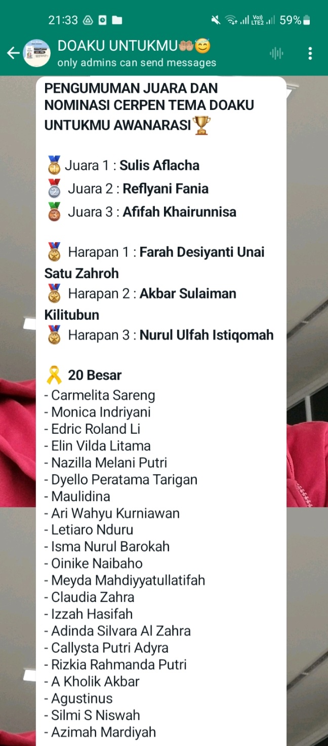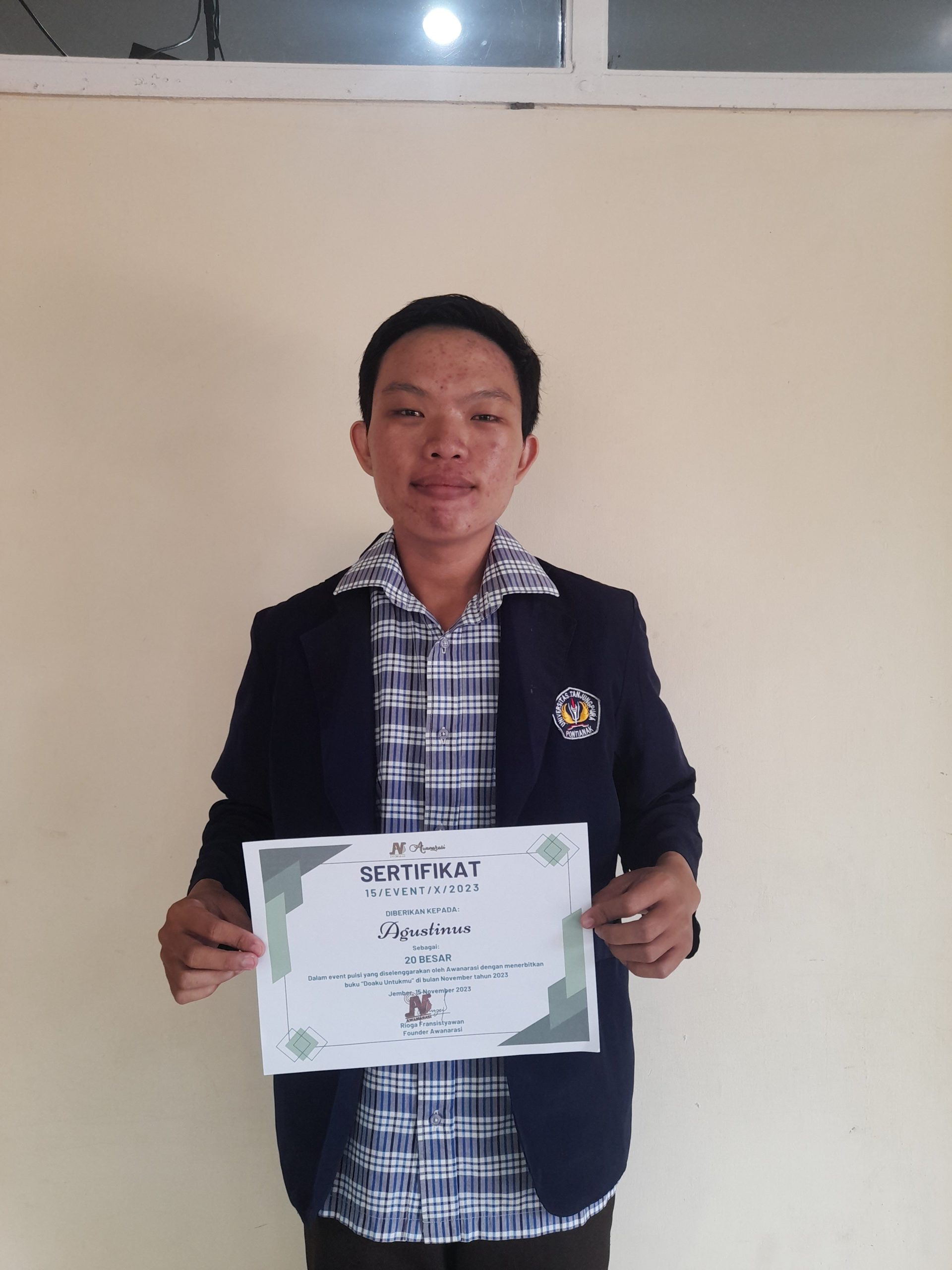 Event Puisi dengan Tema: Doaku Untukmu merupakan kompetisi menulis puisi tingkat nasional yang diselenggarakan oleh Awanarasi tahun 2023 dengan mengangkat tema Doaku Untukmu. Ajang perlombaan ini memberikan kesempatan bagi penulis seluruh Indonesia untuk menerbitkan karyanya dalam buku yang berjudul sama dengan tema yang diangkat. Agustinus (F1021201054), mahasiswa Pendidikan Bahasa Inggris menjadi salah satu peserta yang karya puisinya terpilih untuk dibukukan. Selain itu, ia juga berhasil masuk 20 besar penulis terpilih dalam ajang tersebut.