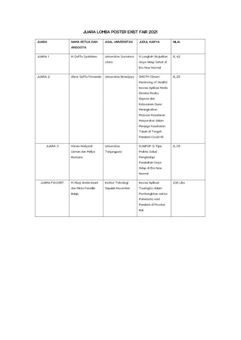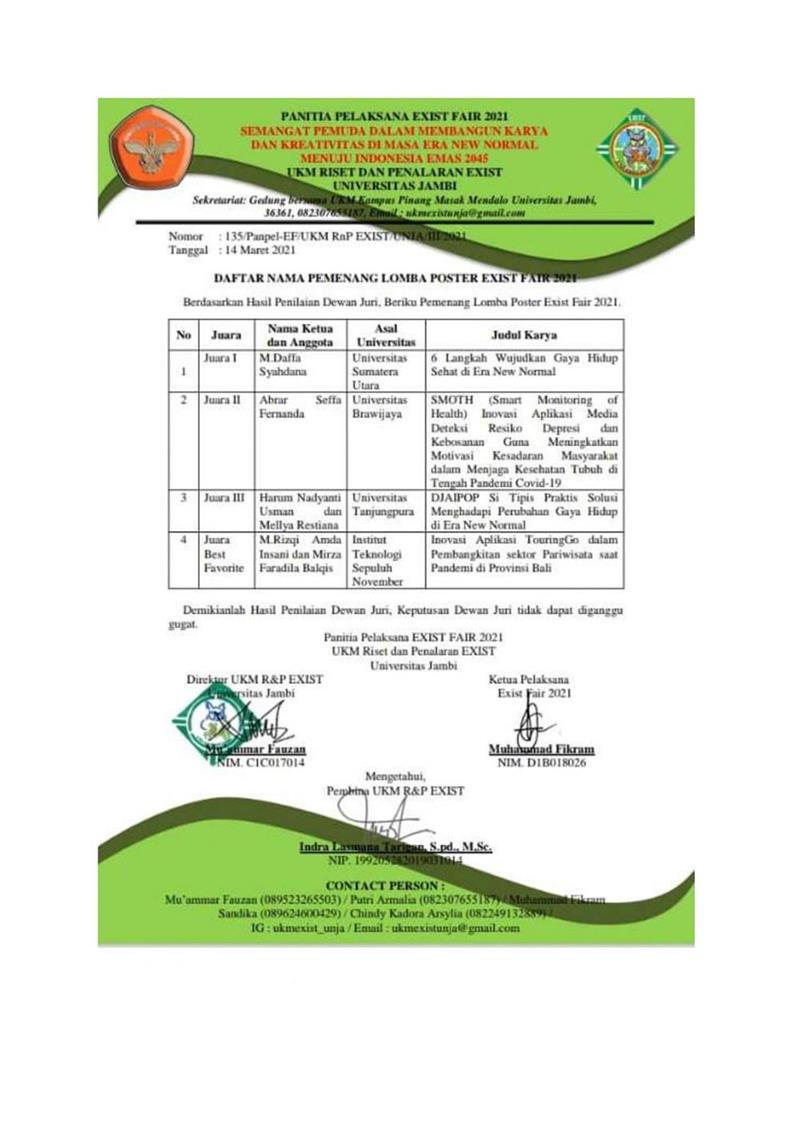 +EXIST FAIR 2021 merupakan sebuah program kerja yang diselenggarakan oleh UKM Riset dan Penalaran Universitas Jambi. EXIST FAIR merupakan suatu rangkaian kegiatan yang terdiri dari berbagai macam lomba dan seminar yang dilakukan secara daring.  EXIST FAIR hadir sebagai wadah dalam pengembangan diri yang ditujukan kepada mahasiswa Indonesia dari berbagai perguruan tinggi di Indonesia untuk menuangkan ide maupun gagasannya dengan kreatif, inovatif, dan inspiratif dalam bentuk poster. Harum Nadyanti Usman I1021191029 dan Mellya Restiana I1021191032 Mendapat Juara 3