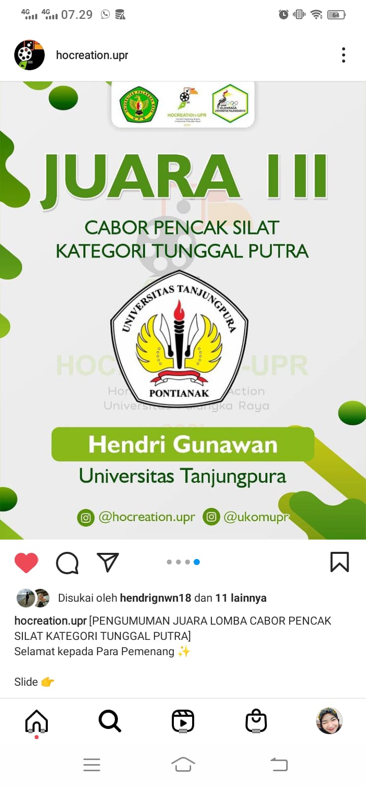 Hornbill Creativity Action Universitas Palangka Raya (HOCREATIONUPR) 2021 terbuka se-Indonesia. Tanggal kegiatan 01 November – 15 Desember 2021. Hendri Gunawan, F1101191034 mahasiswa FKIP Untan Prodi Pendidikan Jasmani angkatan 2019 mendapatkan juara 3 dalam kejuaraan antar Perguruan Tinggi Tingkat Nasional. Setelah mengalahkan wakil dari Universitas Maarif Hasyim Latif.