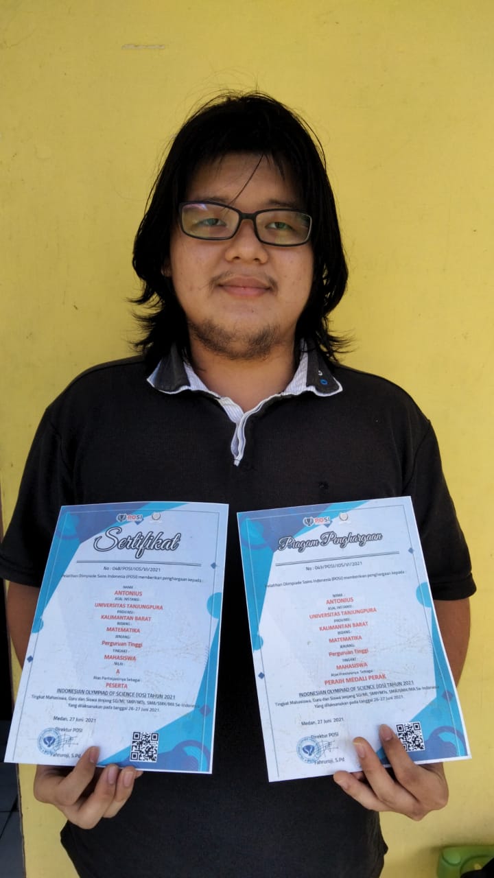 Indonesian Olympiad of Science (IOS) 2021 dilaksanakan pada tanggal 26-27 Juni 2021 dengan jumlah peserta 411 orang dari 85 Universitas salah satunya adalah Universitas Tanjungpura. Indonesian Olympiad of Science (IOS) 2021 adalah sebuah event kompetisi yang diselenggarakan oleh Pelatihan Olimpiade Sains Indonesia (POSI) dengan tujuan untuk memfasilitasi mahasiswa untuk berprestasi dan menjadi sarana evaluasi kemampuan mahasiswa untuk mengembangkan kapasitas diri dan kompetensi secara mendalam. Tim Universitas Tanjungpura diwakili oleh Antonius (H1031181052) berhasil meraih Medali Perak (Juara 2) Bidang Matematika pada Indonesian Olympiad of Science (IOS) 2021.