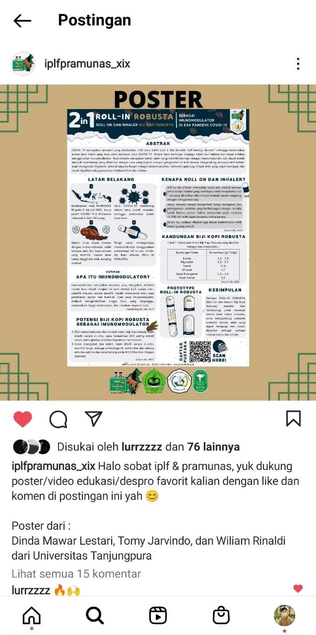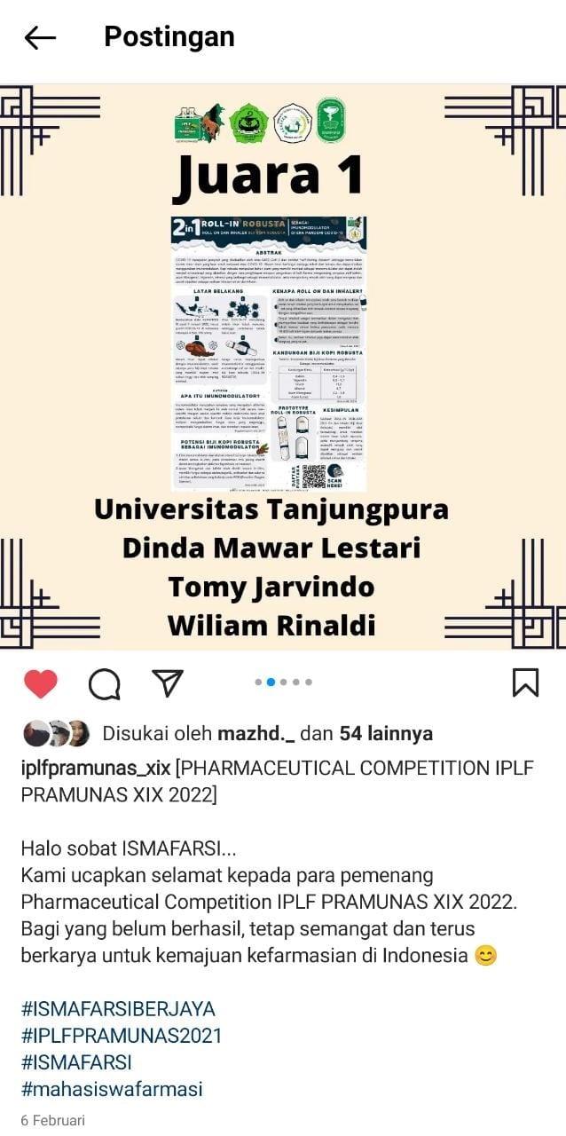 Meningkatkan Sistem Imun terhadap Covid-19”. Mahasiswa Farmasi Fakultas Kedokteran Universitas Tanjungpura diwakili oleh 1 tim untuk mengikuti lomba Poster Ilmiah yaitu Tomy Jarvindo, William Rinaldi dan Dinda Mawar Lestari. Kegiatan Lomba Poster Ilmiah ini diikuti oleh 18 tim dari 18 perguruan tinggi baik negeri maupun swasta yang ada diwilayah Indonesia. Poster yang dibuat berjudul “2 in 1 Roll – In Robusta Roll on and Inhaler Biji Kopi Robbusta”. Poster yang dibuat dikumpulkan pada Tanggal 15 Januari 2022 dan dinilai oleh juri. Kegiatan dilakukan secara virtual dan pengumuman juara dilakukan pada Tanggal 6 Februari 2022 yang mana tim dari Farmasi FK UNTAN berhasil menyabet gelar Juara I Lomba Poster Ilmiah