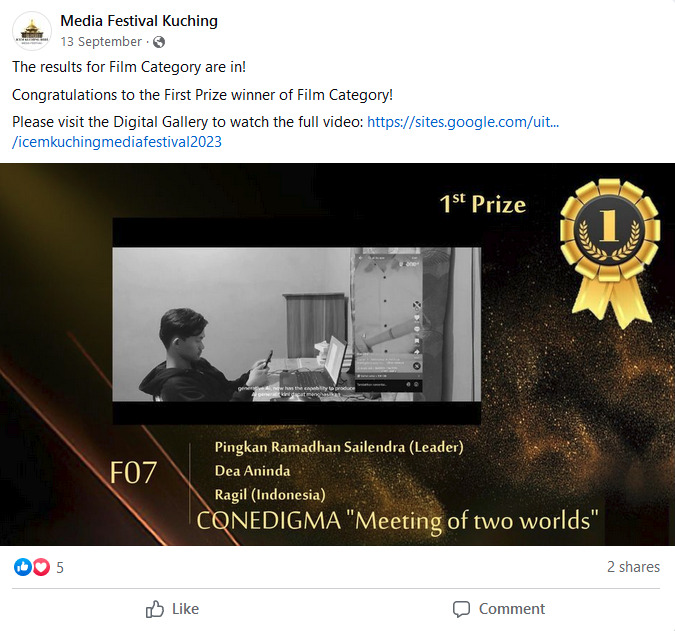 Universitas Tanjungpura Berhasil Meraih Juara 1 kategori film pendek dalam Lomba Media Festival Film and Photography Competition Organized in Conjungction With the Annual Conference of the International Council for Educational Media (ICEM) 2023 University Teknologi MARA Cawangan Sarawak (UiTM) tingkat Internasional.