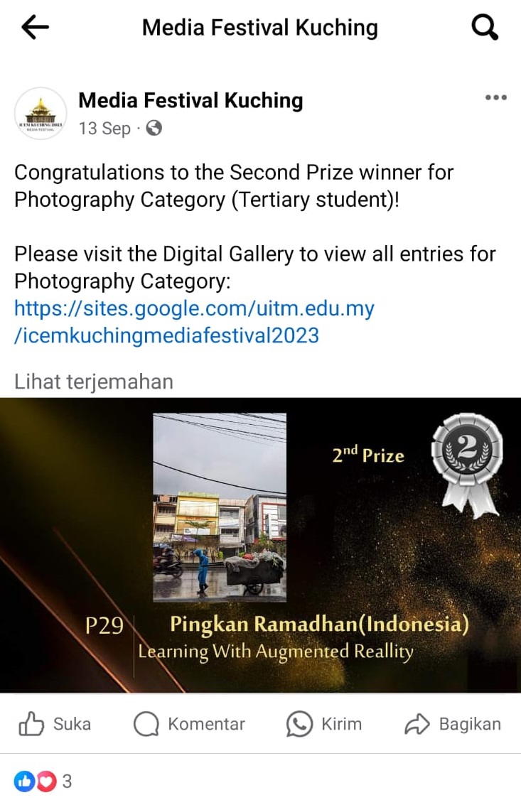 Pingkan Ramadhan Sailendra Mahasiswa Program Studi Pendidikan Kimia Universitas Tanjungpura Berhasil Meraih Juara 2 kategori Photografhy Lomba Media Festival Film and Photography Competition Organized in Conjungction With the Annual Conference of the International Council for Educational Media (ICEM) 2023 University Teknologi MARA Cawangan Sarawak (UiTM) tingkat Internasional.