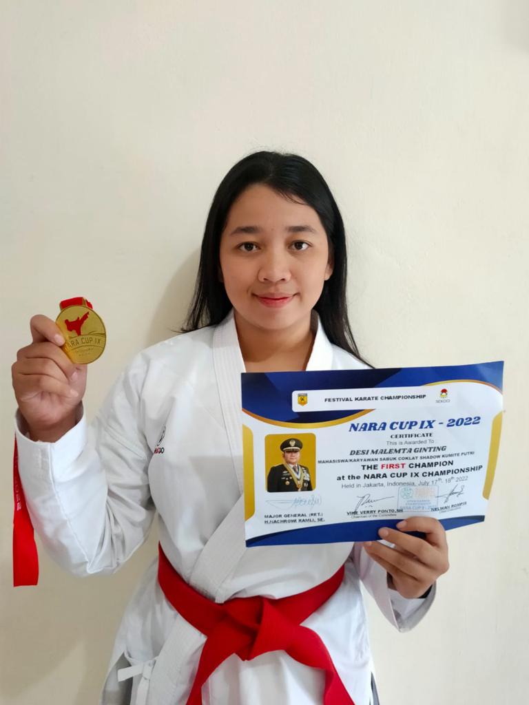 Desi Malemta Ginting, NIM E1021181021. Mahasiswa dari Fakultas Ilmu Sosial dan Ilmu Politik, Jurusan Ilmu Sosiatri. Berhasil meraih juara 1 Shadow Kumite Putri, di Kejuaraan Internasional Virtual Open Karate Tournament Nara Cup IX 2022.