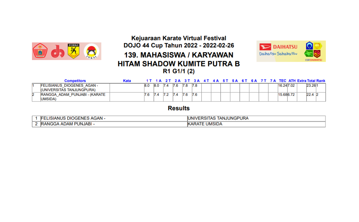 Felisianus Diogenes Agan, Nim D1031191003. Mahasiswa dari Fakultas Teknik, jurusan Arsitektur, berhasil meraih juara 1 Shadow Kumite Perorangan Putra, di Kejuaraan Nasional Karate Virtual 2022 Dojo 44 Cup