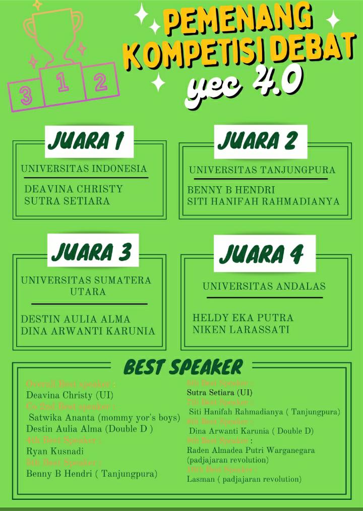 Lomba Debat YEC 4.0 merupakan lomba debat mahasiswa tingkat nasional yang diselenggarakan oleh Himpunan Ekonomi Pembangunan Universitas Muhammadiyah Sumatra Utara pada tanggal 28 – 29 Mei tahun 2022. Lomba ini dilaksanakan secara online melalui platform zoom meetings. Lomba ini diikuti oleh 24 tim yang berasal dari berbagai perguruan tinggi yang berbeda. Total peserta berjumlah 48 orang. Dalam perlombaan ini, Benny B Hendri dan Siti Hanifah Rahmadianya berhasil meraih Juara 2 dan Pembicara Terbaik (5th Best Speaker Benny B Hendri, 7th Best Speaker Siti Hanifah Rahmadianya)