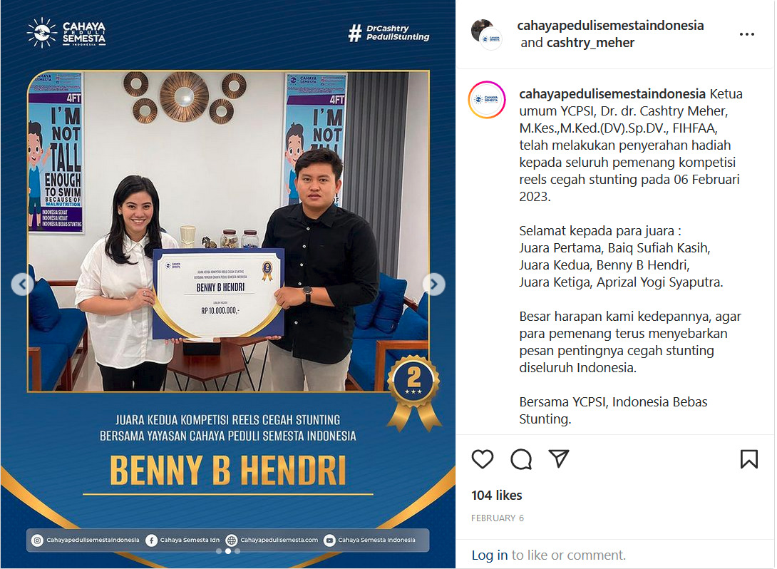 Kompetisi Reels Cegah Stunting diselenggarakan oleh Yayasan Cahaya Peduli Semesta Indonesia yang merupakan organisasi pemberantasan stunting melalui sosialisasi dan langkah nyata dalam masyarakat. Kompetisi ini terbuka untuk seluruh golongan masyarakat.
