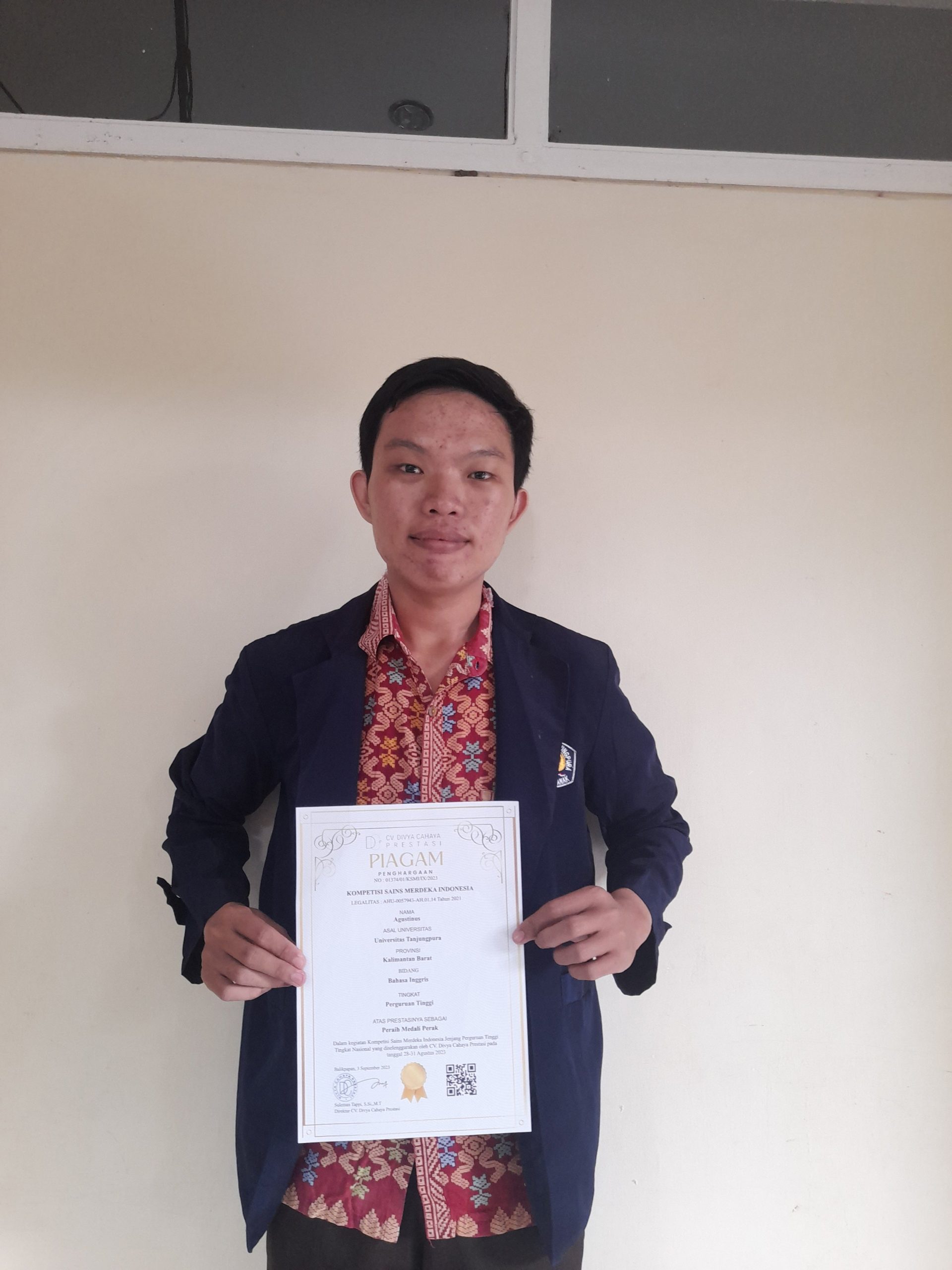Kompetisi Sains Merdeka Indonesia (KSMI) merupakan ajang perlombaan sains tingkat nasional yang diadakan oleh CV. Divya Cahaya Prestasi. Kompetisi ini dilaksanakan secara daring pada tanggal 28-31 Agustus dan diikuti oleh peserta se-Indonesia dari berbagai jenjang mulai dari SD, SMP, SMA, Mahasiswa, hingga Guru. Mahasiswa Pendidikan Bahasa Inggris, Agustinus (F1021201054) menorehkan prestasi dalam ajang tersebut dengan berhasil meraih medali perak untuk bidang Bahasa Inggris jenjang Mahasiswa.