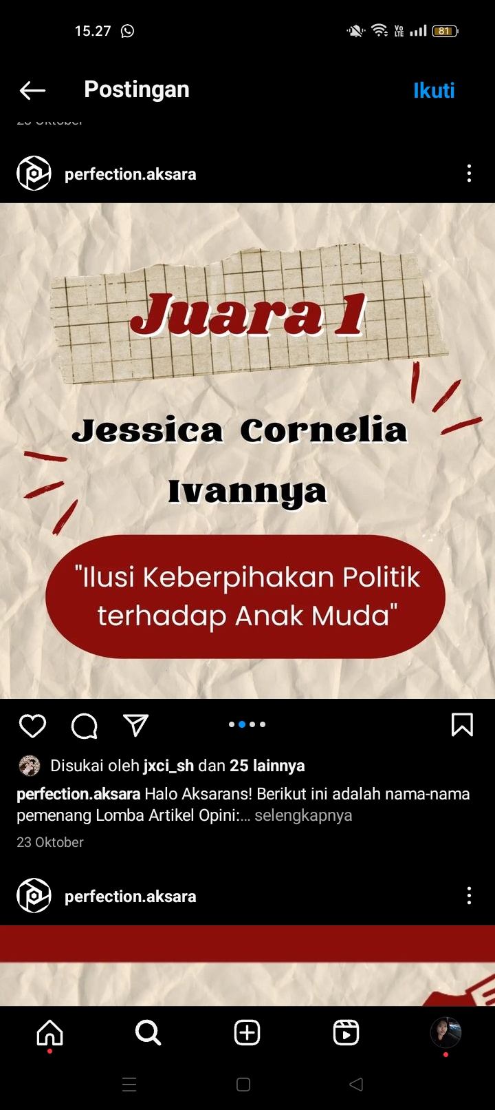 Lomba Artikel Opini Perfection Aksara Jurnalistik Telkom University 2023 merupakan lomba menulis opini se-Indonesia dengan tema “Ketertarikan Gen Z terhadap Politik Indonesia Menjelang Pilpres 2024” yang diadakan oleh Unit Kegiatan Mahasiswa Aksara Jurnalistik Telkom University. Lomba ini digelar pada 27 September 2023 hingga 22 Oktober 2023.