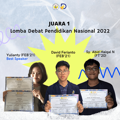 Lomba Debat Pendidikan Nasional 2022 menjadi salah satu ajang perlombaan debat dalam lingkup mahasiswa tingkat nasional yang diselenggarakan oleh Himpunan Mahasiswa Manajemen pendidikan, Universitas Negeri Jakarta (UNJ) melalui rangkaian acara MP EXPO 2022 dengan tema “Mewujudkan Peran Mahasiswa Sebagai Guardian of Value Pendidikan Indonesia”. Kegiatan ini berlangsung secara online melalui media zoom meeting pada tanggal 6,12, dan 13 November 2022 yang diikuti oleh 16 tim dari berbagai perguruan tinggi di Indonesia dengan total peserta sebanyak 48 orang yang menggunakan sistem debat Asian Parliamentary dalam pelaksanaannya. Universitas Tanjungpura turut berkontribusi dalam kegiatan ini dengan mendelegasikan mahasiswa UKM DUTY (Debating Union of Tanjungpura University) yaitu Sy. Abid Haiqal Nazar (FT’20), Yulianty (FEB’21), dan David Ferianto yang kemudian berhasil meraih Juara 1 ‘Kategori Tim” dan Yulianty yang berhasil meraih nominasi ‘Best Speaker’.