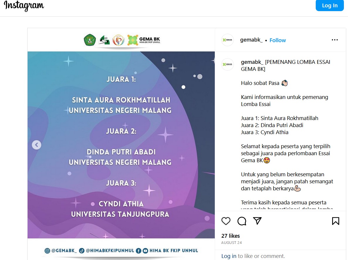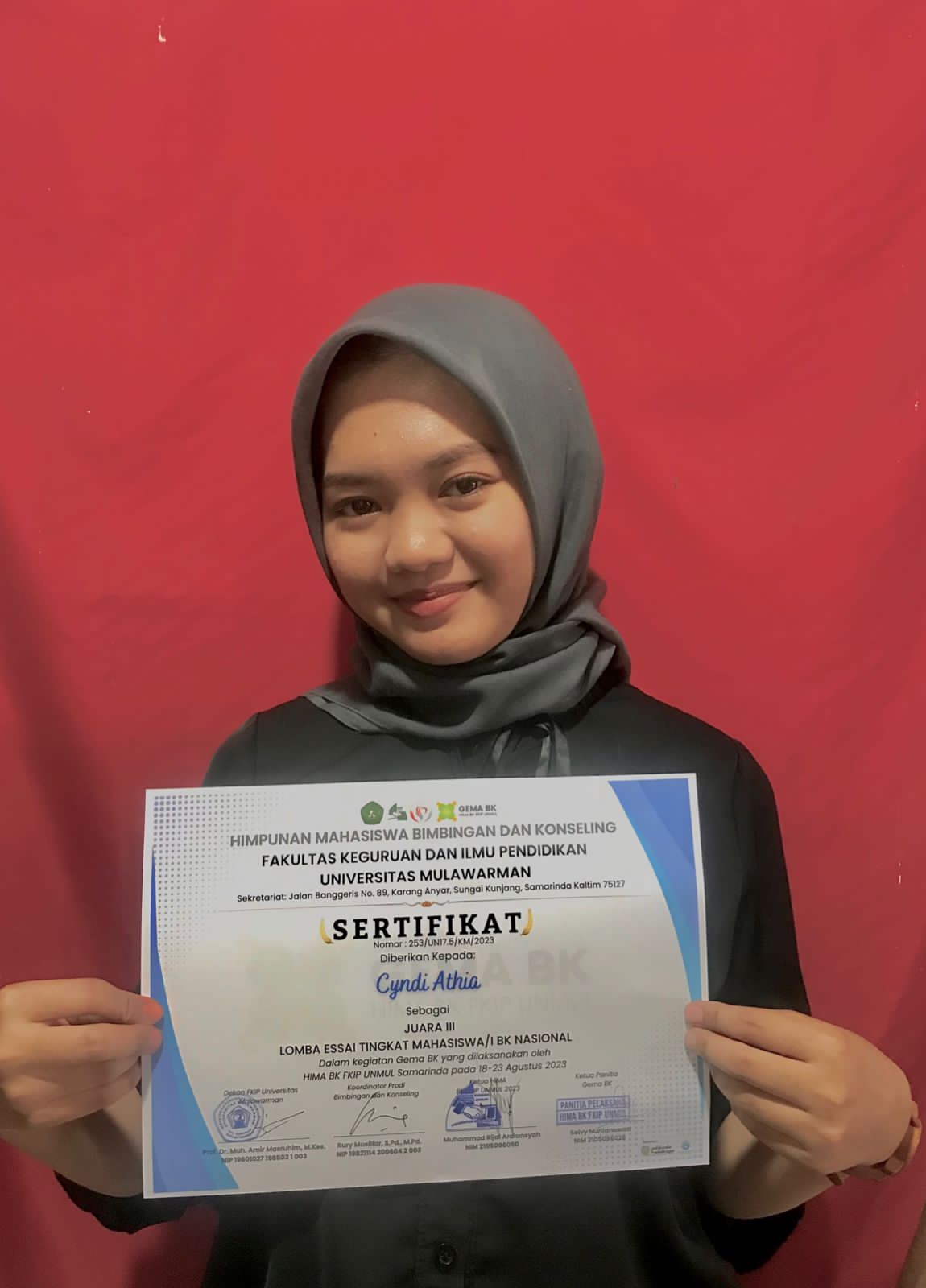 Himpunan Mahasiswa Bimbingan dan Konseling Universitas Mulawarman mengadakan Perlombaan Penulisan Essai dengan Tema “Peran dan Praktik Guru BK” dalam kegiatan Gema BK yang dilaksanakan pada tanggal 18 – 23 Agustus 2023. Dalam Lomba tersebut Mahasiwi Prodi Bimbimbingan Konseling FKIP Universitas Tanjungpura Meraih Juara 3 an. Cyndi Athia dengan NIM F1141201022.