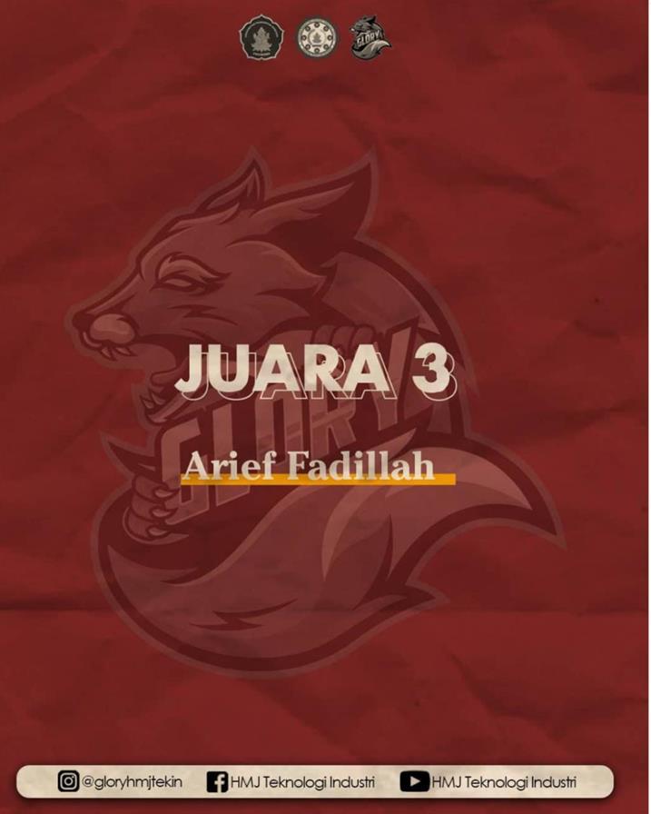Dalam rangka pelaksanaan Kegiatan Tahunan Jurusan Teknologi Industri tahun 2021 dengan tema “Tek-In EUFORIA (Excellent, Unique, Famous, Optimis, Responsible , Incredible , Awesome)” Arief Fadillah Mendapatkan Juara 3 tingkat nasional kategori esai