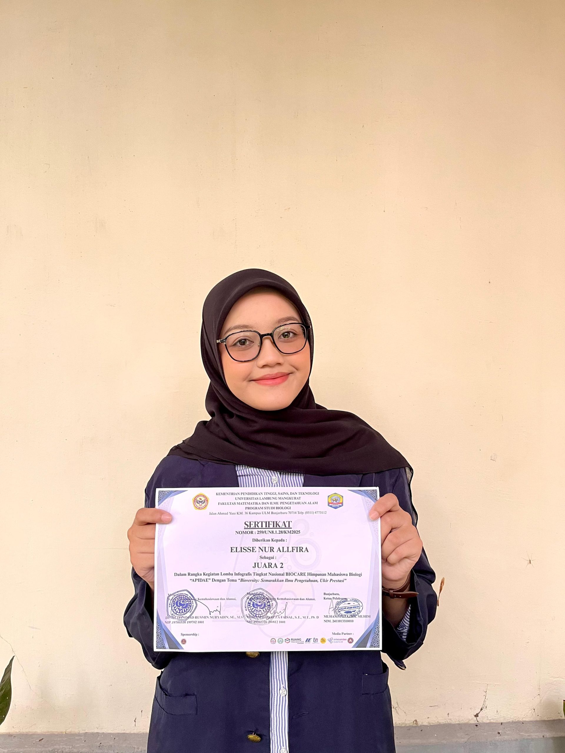 Dalam kegiatan ini, Elisse Nur Allfira (Universitas Tanjungpura) berhasil meraih Juara 2 Lomba Infografis Tingkat Nasional melalui karya berjudul “Brotowali: Perisai Alami Imunitas Tubuh”. Karya tersebut menampilkan pemanfaatan tanaman obat tradisional Brotowali sebagai alternatif alami untuk meningkatkan sistem imun tubuh, dilengkapi dengan informasi kandungan bioaktif, mekanisme kerja, serta manfaat kesehatannya. Prestasi ini menjadi bukti kontribusi nyata dalam mengomunikasikan sains secara kreatif sekaligus mendukung penerapan pengetahuan biologi bagi masyarakat luas.