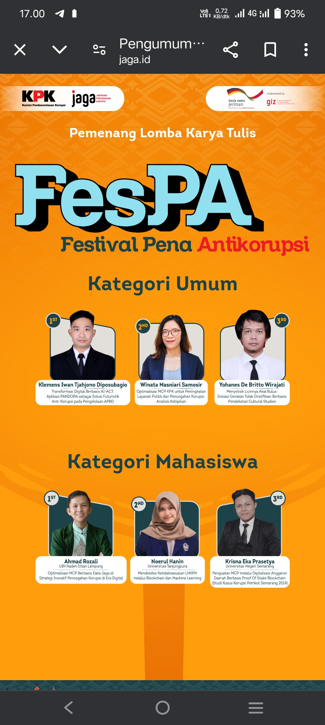 Noerul Hanin menjadi Juara 2 dalam Lomba Karya Tulis Festival Pena Antikorupsi (FesPA) 2024 yang diadakan oleh Komisi Pemberantasan Korupsi Republik Indonesia (KPK RI). Kegiatan dibagi menjadi dua kategori, yakni mahasiswa dan umum. Sebelum pengumuman pemenang, 6 finalis dari masing-masing kategori menjalani tahap inkubasi dan mentoring bersama para mentor-mentor ahli yang ditunjuk langsung oleh KPK RI.