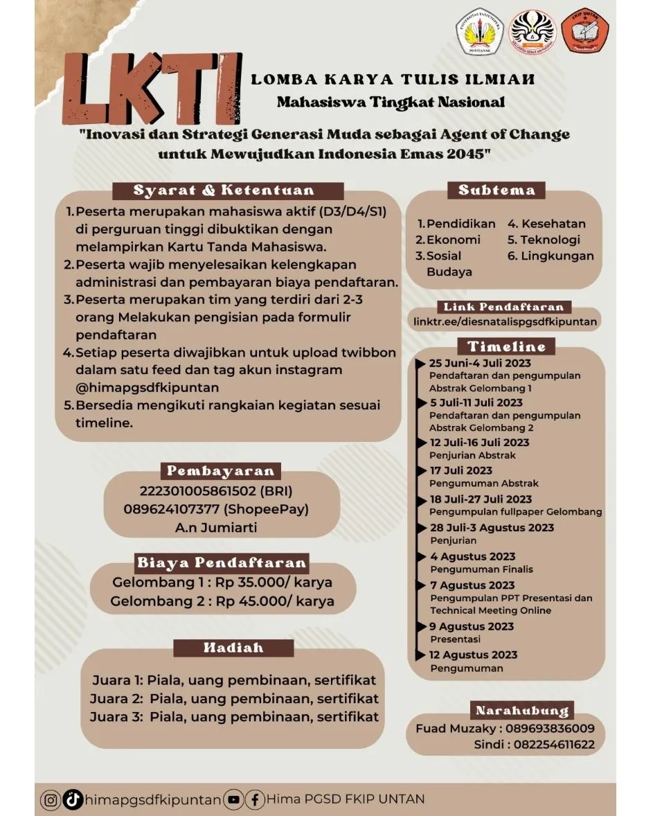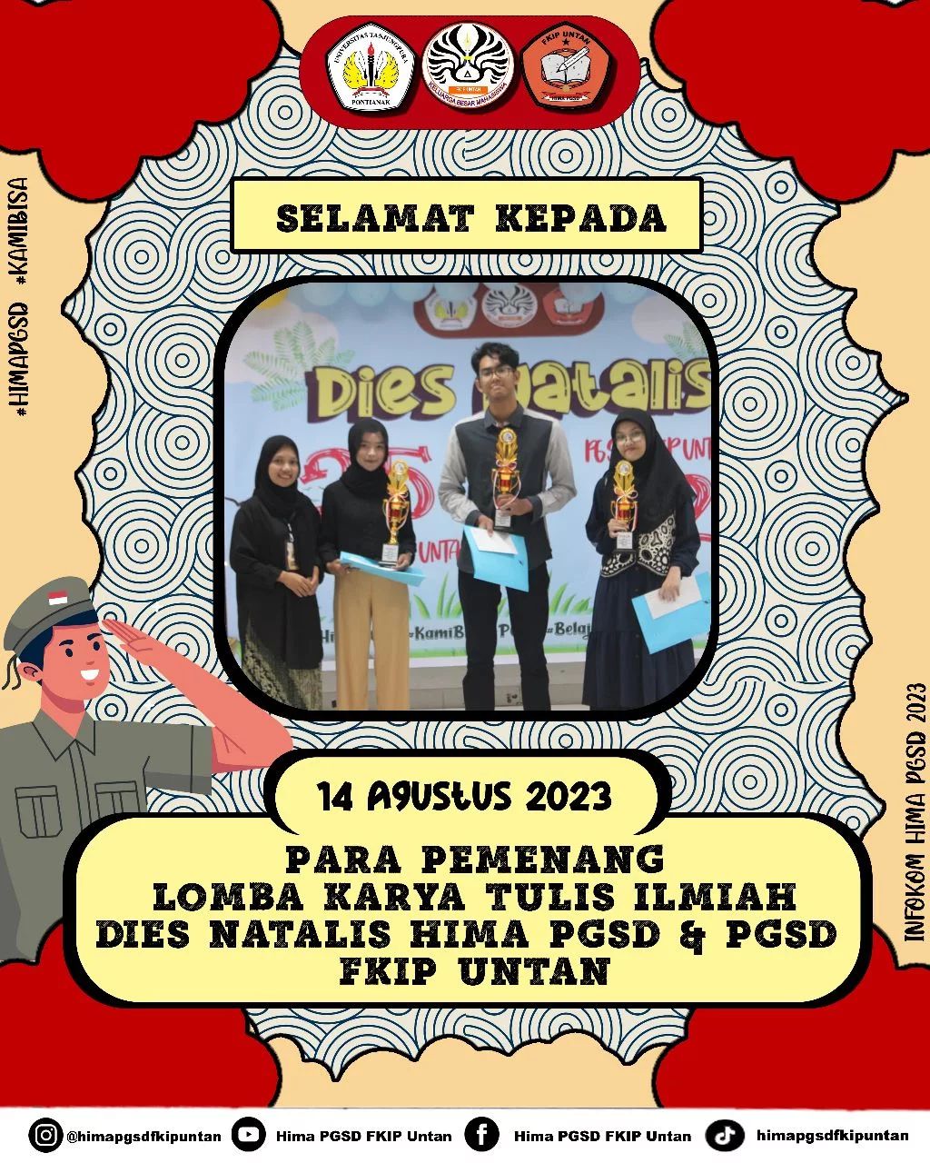 Himpunan Mahasiswa Pendidikan Sekolah Dasar Fakultas Keguruan dan Ilmu Pendidikan Universitas Tanjungpura mengadakan Lomba Karya Tulis Ilmiah dalam rangka memperingati Dies Natalis Hima PGSD yang ke-25 dan Prodi PGSD FKIP UNTAN yang ke-32 pada tahun 2023. Lomba Karya Tulis Ilmiah diadakan secara online pada 25 Juni 2023 hingga 14 Agustus 2023 dengan tema “Inovasi dan Strategi Generasi Muda sebagai Agent of Change untuk Mewujudkan Indonesia Emas 2045″. Tujuan diadakannya Lomba Karya Tulis Ilmiah ini yaitu untuk menggali kreativitas mahasiswa Indonesia sebagai agent of change dalam menghadapi Indonesia Emas 2045 melalui karya tulis ilmiah.