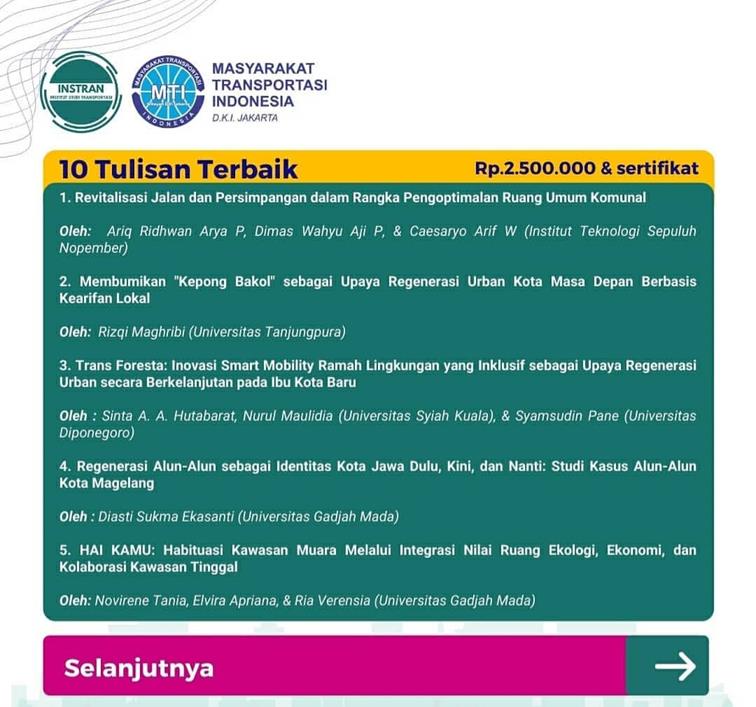 Pelaksaaan Lomba Penulisan Gagasan Ilmiah tentang “Regenerasi Urban Tingkat Nasional 2021” yang diselenggarakan oleh Institut Studi Transportasi (INSTRAN) dan Masyarakat Transportasi Indonesia (MTI) memberikan peluang kepada generasi muda untuk menuangkan ide dangagasan dalam bentuk tulisan ilmiah dengan desain khusus. Lomba ini juga menjadi rangkaian kegiatan dari sesi diskusi mengenai Regenerasi Urban yang digagas oleh Prof. Dr. Danang Parikesit. Lomba mulai dipublikasikan pada bulan April 2021 melalui sosial media, jejaring dosen di beberapa perguruan tinggi, dan praktisi perkotaan. Lalu, peserta yang sudah registrasi diberikan deadline pengumpulan pada 28 Mei 2021. Berdasarkan laporan panitia pada puncak acara pengumuman pemenang, terdapat ratusan naskah yang mengikuti perlombaan tersebut baik secara individu maupun berkelompok. Proses penilaian dilakukan secara ketat melalui 2 tahapan, pertama yakni kesesuaian judul dan isi tulisan. Adapun yang kedua, dilakukan penilaian isi gagasan oleh dewan juri dengan menghilangkan identitas penulis agar menjaga netralitias dan objektivitas penilaian.