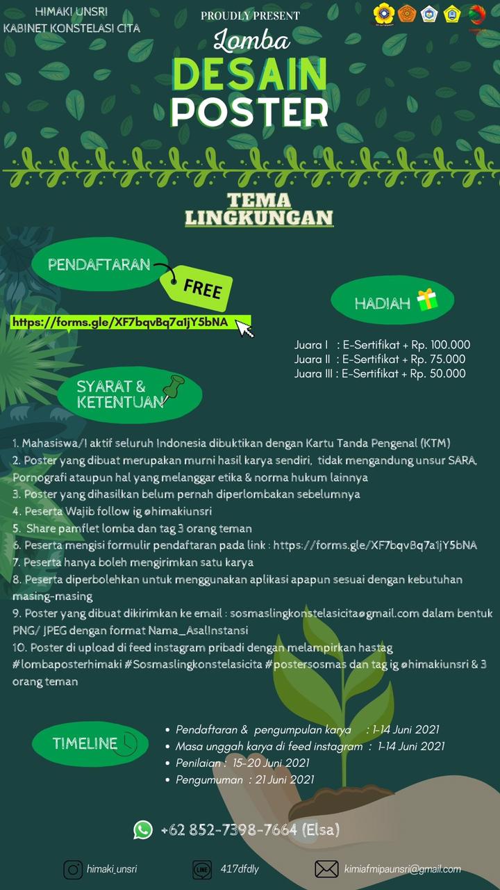 Lomba Poster Himaki merupakan lomba poster yang diselenggarakan oleh Himpunan Mahasiswa Kimia (Himaki) Universitas Sriwijaya. Lomba ini dimulai dari tanggal 1 Juni hingga 14 Juni 2021 dan ditutup dengan pengumuman pemenang pada tanggal 21 Juni 2021. Lomba ini mengusung tema “Lingkungan”. Pada kesempatan kali ini, mahasiswa Fakultas MIPA Universitas Tanjungpura, Ericco Wijayanto (H1031191039) berhasil meraih Juara 1 pada lomba tersebut.