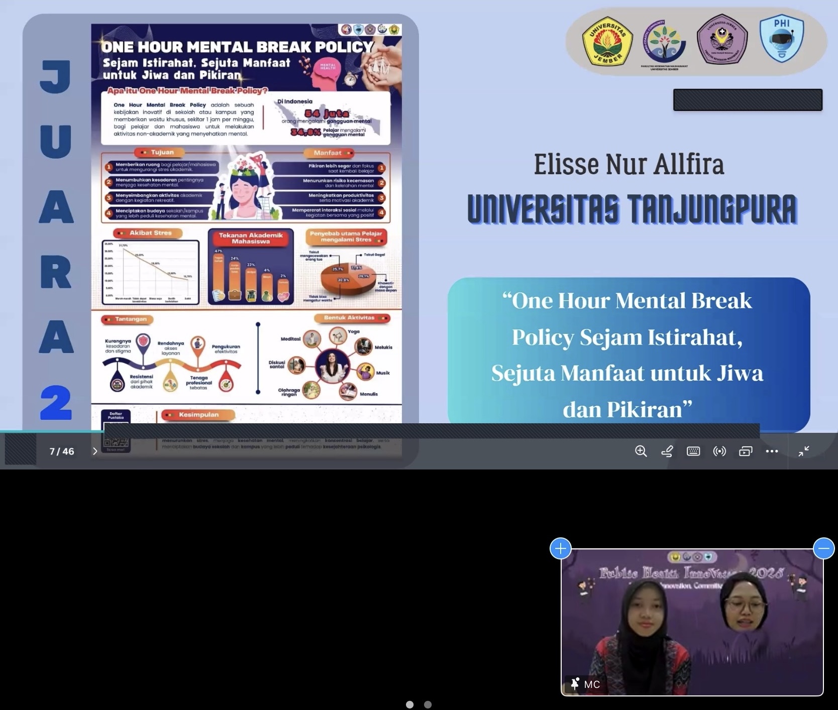 Dalam kegiatan tersebut, Elisse Nur Allfira dari Universitas Tanjungpura berpartisipasi dalam kategori Poster Infografis dengan karya berjudul “One Hour Mental Break Policy: Sejam Istirahat, Sejuta Manfaat untuk Jiwa dan Pikiran.” Karya ini mengusung gagasan inovatif tentang kebijakan satu jam istirahat per minggu bagi pelajar dan mahasiswa untuk menjaga kesehatan mental dan meningkatkan produktivitas belajar. Melalui ide yang inspiratif dan desain yang komunikatif, Elisse berhasil meraih Juara 2 Nasional Lomba Poster Infografis HIPERTEN 2025, sebagai bentuk kontribusi nyata dalam mempromosikan kesadaran kesehatan mental di dunia pendidikan.