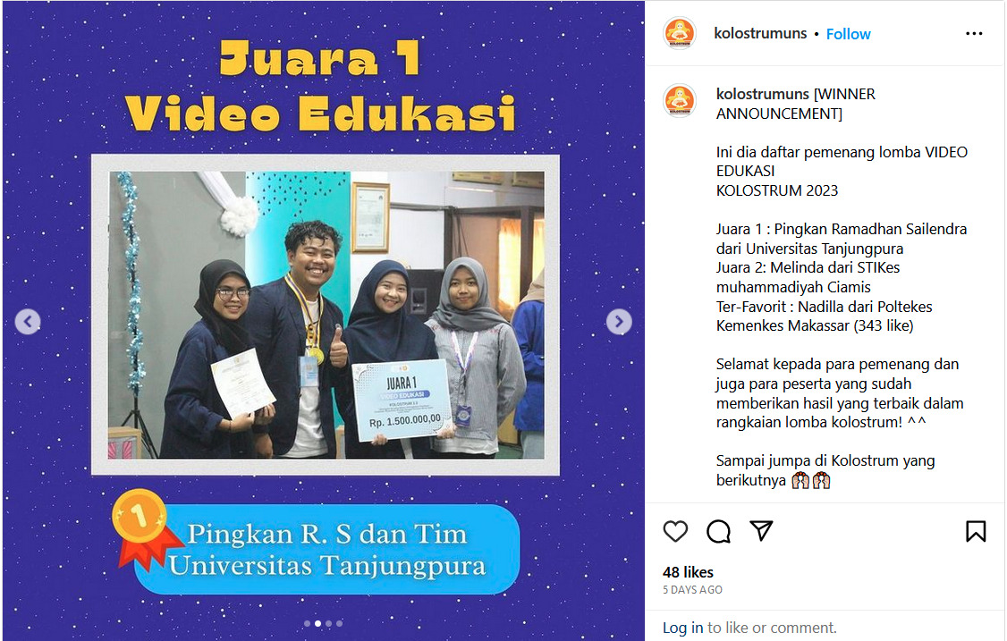 Tim Pendidikan Kimia FKIP UNTAN yang beranggotakan Pingkan Ramadhan Sailendra, Dea Aninda, dan Rosiana Pitri berhasil meraih juara 1 lomba video edukasi yang diselenggarakan oleh Himpunan Mahasiswa Kebidanan Fakultas Kedokteran Universitas Sebelas Maret pada 18-19 November 2023. Lomba ini berskala nasional dan bertemakan “Melangkah Bersama Melalui Peningkatan Kesadaran Kesehatan Reproduksi Remaja Sebagai Revolusi Remaja Masa Depan Lebih Sehat”. Tujuan diadakannya lomba ini yaitu agar mahasiswa Indonesia dapat menggali kreativitas dan potensinya dalam mengedukasi remaja maupun masyarakat secara umum untuk lebih memperhatikan kesehatan reproduksinya.