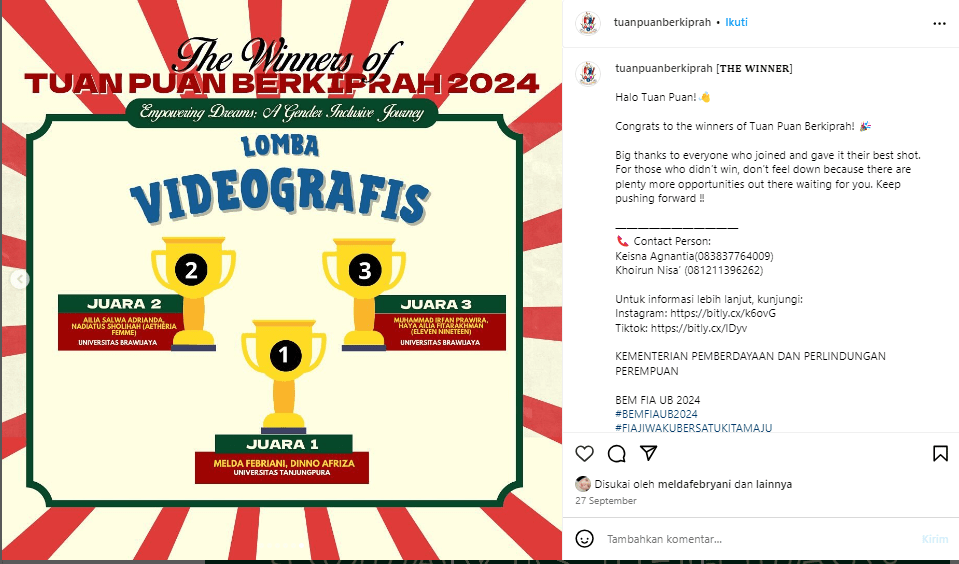 Melda Febriani dan Dino Afriza mahasiswa Program Studi Pendidikan Kimia Univeristas Tanjungpura berhasil meraih Juara 1 pada Lomba Videografis Tuan Puan Berkiprah Universitas Brawijaya 2024. Tuan Puan Berkiprah 2024 merupakan kegiatan yang diadakan oleh BEM Fakultas Ilmu Administrasi Universitas Brawijaya. Kegiatan ini diadakan dengan mengusung tema: Empowering Dreams: A Gender-Inclusive Journey oleh Kementerian Pemberdayaan dan Perlindungan Perempuan BEM FIA Universitas Brawijaya.
