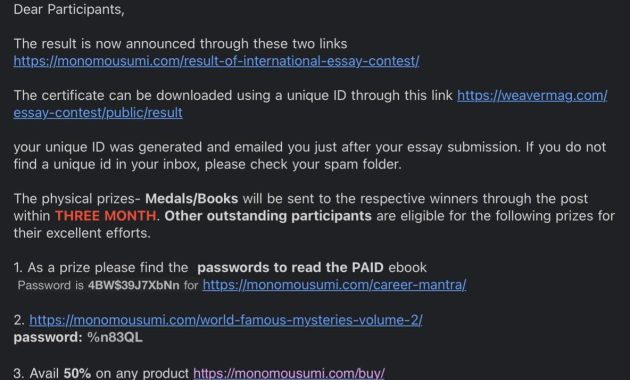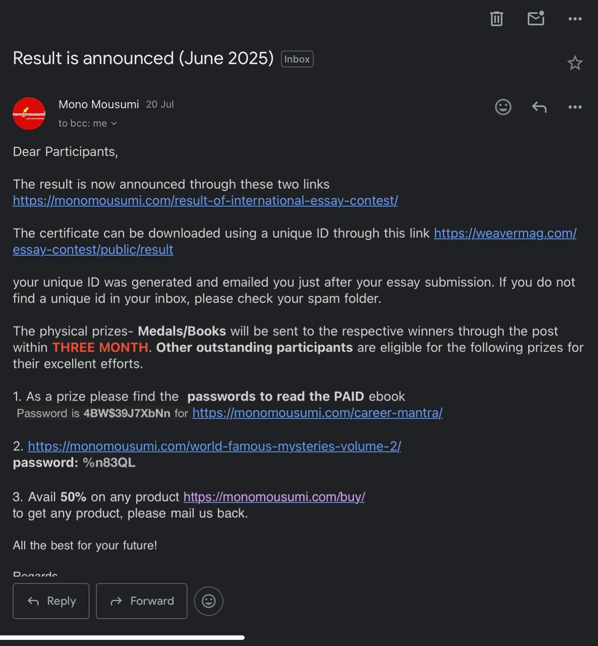 International Essay Contest yang diselenggarakan oleh Monomousumi, sebuah platform Edu-tech non-komersial International Standard Organization dan pemegang rekor internasional, merupakan ajang bergengsi yang ditujukan untuk mengasah kemampuan menulis, berpikir kritis, dan kreativitas para peserta dari seluruh dunia. Monomousumi telah menjadi pelopor dalam memadukan teknologi dengan kegiatan ekstrakurikuler literasi, khususnya dalam bidang kepenulisan.