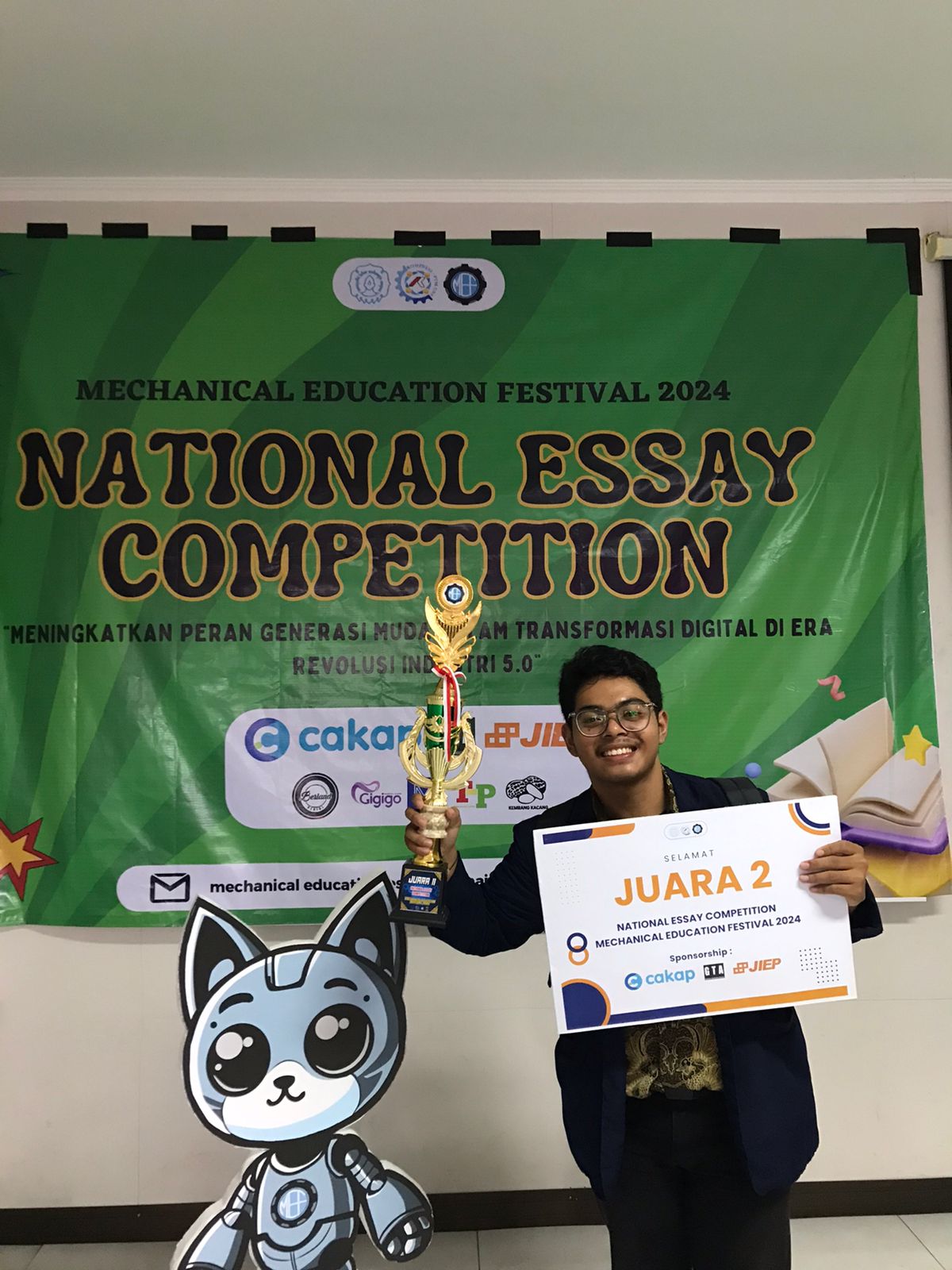 Muhammad Arief Bestari (D1021211061) mahasiswa Teknik Elektro dan anggota tim SIN HUI (D1011211069) mahasiswa Teknik Sipil serta bimbingan terbaik dari Eka Kusumawardhani S.T.,M.T. (Dosen Teknik Elektro) berhasil menjuarai Lomba Esai Ilmiah yang diadakan oleh Universitas Sebelas Maret (UNS) Kota Surakarta.