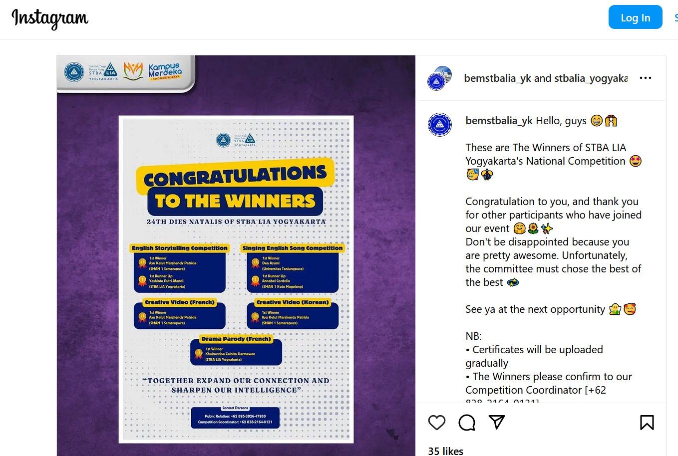 Dalam rangka Dies Natalis STBA LIA Yogyakarta, yang diselenggarakan oleh BEM STBA LIA Yogyakarta, Dea Ayumi dari Administrasi Publik Fisip Untan sebagai wakil dari Universitas Tanjungpura Tahun 2024. Dea Ayumi mendapatkan Juara 1, kegiatan Dilaksanakan pada tanggal 5-19 September 2024.