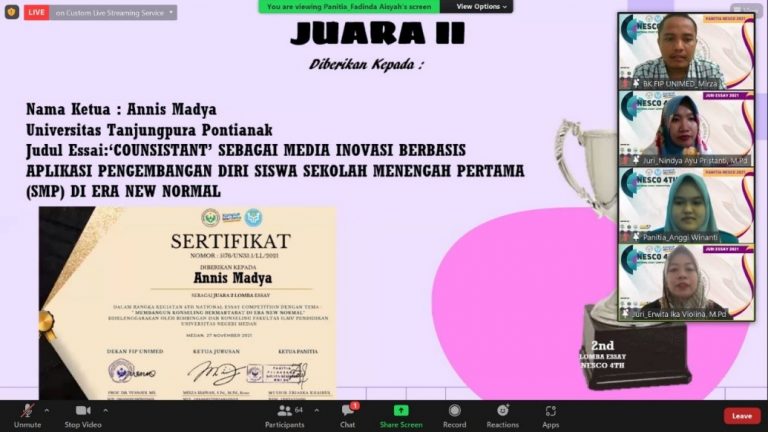 Kegiatan Lomba Nasional Essay Competition di adakan secara virtual di Universitas Negeri Medan, Final Presentasi finalis diadakan pada tanggal 27 Desember 2021. Tim Universitas Tanjungpura beranggotakan