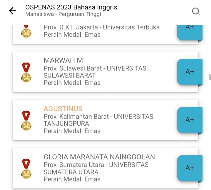 tersebut, Agustinus (F1021201054) berhasil meraih Medali Emas bidang Bahasa Inggris