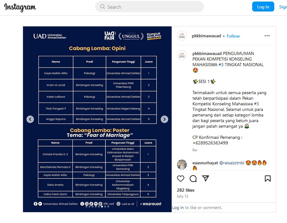 Pekan Kompetisi Konseling Mahasiswa #3 Tingkat Nasional Tahun 2024 adalah salah satu rangkaian kegiatan penutupan UAD FAIR 2024. Kegiatan ini diselenggarakan oleh Biro Kemahasiswaan dan Alumni Universitas Ahmad Dahlan pada tanggal 12 Juli 2024. Pada kesempatan ini mahasiswa FKIP Universitas Tanjungpura an. Indira Fianti Utami berhasil menjadi Juara 5 Lomba Poster dengan Sub Tema Fear od Marriage.