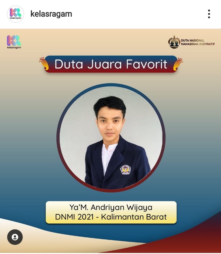 Ya’ M. Andriyan Wijaya NIM E1041211003 Prodi Sosiologi. Duta Nasional Mahasiswa Inspiratif adalah ajang pemilihan Mahasiswa/i aktif di Indonesia yang dinaungi oleh Kelas Ragam dan telah berkarya memberikan dampak bagi lingkungannya.Pemilihan ini di selenggarakan untuk menjaring para Mahasiswa/i yang selama ini telah mengabadikan diri bagi masyarakat. Duta Nasional Mahasiswa Inspiratif sebagai ajang kolaborasi pemuda-pemudi Indonesia 34 Provinsi untuk saling bersinergi menciptakan ragam karya dan dampak bersama-sama untuk membangun Indonesia. Dengan semangat pemerataan pendidikan dan akses kesempatan pengembangan diri kepada pemuda-pemudi Indonesia, Duta Nasional Mahasiswa Inspiratif hadir dan mencari pemuda-pemudi inspiratif, berbakat dan kontributif melalui serangkaian proses seleksi yang ketat berupa pemberkasan esai, akumulasi penilaian prestasi atau portofolio, Focus Group Discussion, dan Inkubasi kepemimpinan serta pengembangan diri. Lomba ini dilaksanakan dari tanggal 17 September 2021 sampai 28 Oktober 2021