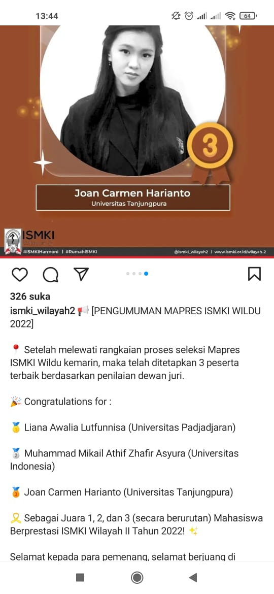 ISMKI (Ikatan Senat Mahasiswa Kedokteran Indonesia) merupakan organisasi mahasiswa kedokteran tertua dan terbesar di Indonesia sekaligus sebagai representasi mahasiswa kedokteran dari Sabang sampai Merauke sejak 1981. ISMKI sendiri terbagi menjadi 4 wilayah dan FK Tanjungpura masuk ke dalam ISMKI Wilayah 2. ISMKI memiliki program kerja besar yang sudah sejak lama diselenggarakan tiap tahunnya, yaitu ajang Pemilihan Mahasiswa Berprestasi (MAPRES) ISMKI. Ajang MAPRES ISMKI Wilayah 2 ini akan mendata, menjaring dan menyeleksi kader-kader mahasiswa berprestasi dari setiap institusi di Wilayah 2 melalui serangkaian proses seleksi. Mahasiswa yang akhirnya terpilih sebagai Mahasiswa Berprestasi ISMKI Wilayah 2 akan mendapat piagam dan penghargaan atas pencapaian yang telah diraih dan dapat mengharumkan nama institusi yang bersangkutan. Selain itu, mahasiswa yang terpilih menjadi MAPRES ISMKI Wilayah 2 akan didelegasikan kembali untuk mewakili Wilayah 2 berkompetisi dengan pemenang dari tiap wilayah dalam ajang Mahasiswa Berprestasi ISMKI Nasional. Dalam ajang MAPRES ini, delegasi dari FK Tanjungpura berkompetisi dengan FK lainnya yang tergabung dalam ISMKI Wilayah 2, seperti FK Universitas Indonesia, Padjajaran, Atma Jaya, Tarumanegara, UPH, Trisakti, Yarsi, Jenderal Ahmad Yani, serta institusi-institusi lainnya. Kompetisi ini diselenggarakan selama hampir 3 bulan, yaitu dari 18 April hingga 2 Juli, dengan tahapan seleksi yang ketat yang terdiri dari dua tahap. Tahap pertama berupa penyeleksian berkas tiap peserta. Adapun dua hal yang menjadi poin penilaian adalah IPK dan riwayat prestasi atau pencapaian. Peserta yang lolos tahap pertama akan maju ke tahap kedua atau tahap final. Delegasi dari FK UNTAN berhasil lolos ke tahap final bersama dengan 7 finalis lain dari FK UI, UNPAD, UNTAR, Trisakti, Yarsi, UNJANI, dan UPNVJ. Pada tahap final, peserta diminta untuk membuat 1 karya tulis ilmiah (KTI) bertema “Pengembangan Teknologi Kedokteran di Era Industri 4.0” serta 1 bahasan studi kasus bertajuk BPJS dan dipresentasikan kehadapan dewan juri disertai dengan sesi tanya jawab pada tanggal 2 Juli lalu. Dalam tahap ini, dewan juri melakukan penilaian secara menyeluruh terhadap KTI yang telah dibuat, serta bagaimana peserta dalam mempresentasikan karya tersebut, mulai dari penguasaan materi, cara & sikap presentasi, hingga bagaimana kemampuan peserta dalam menanggapi atau menjawab pertanyaan yang diberikan dewan juri dalam sesi tanya jawab. Sedangkan pada babak studi kasus, peserta akan dinilai terkait sistematika presentasi dan menjawab pertanyaan dewan juri serta kemampuan menganalisis dan menyelesaikan kasus tersebut. Penentuan pemenang MAPRES ditentukan melalui akumulasi penilaian dari tahap pertama hingga tahap final. Dan pada tahun ini, delegasi dari FK UNTAN, yaitu Joan Carmen Harianto (PSKd 2019), berhasil menempati Juara 3 bersama dengan delegasi FK UNPAD sebagai Juara 1 dan FK UI sebagai Juara 2.