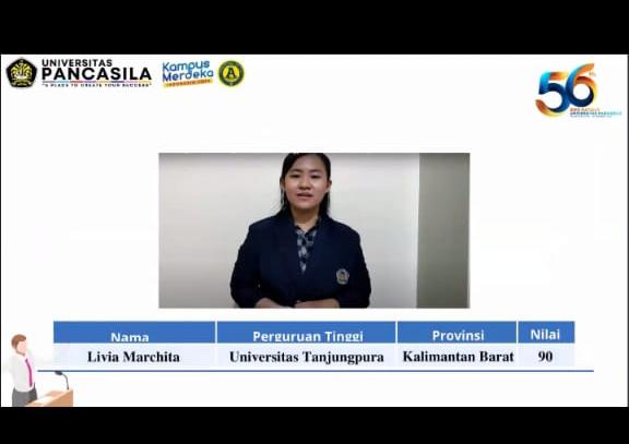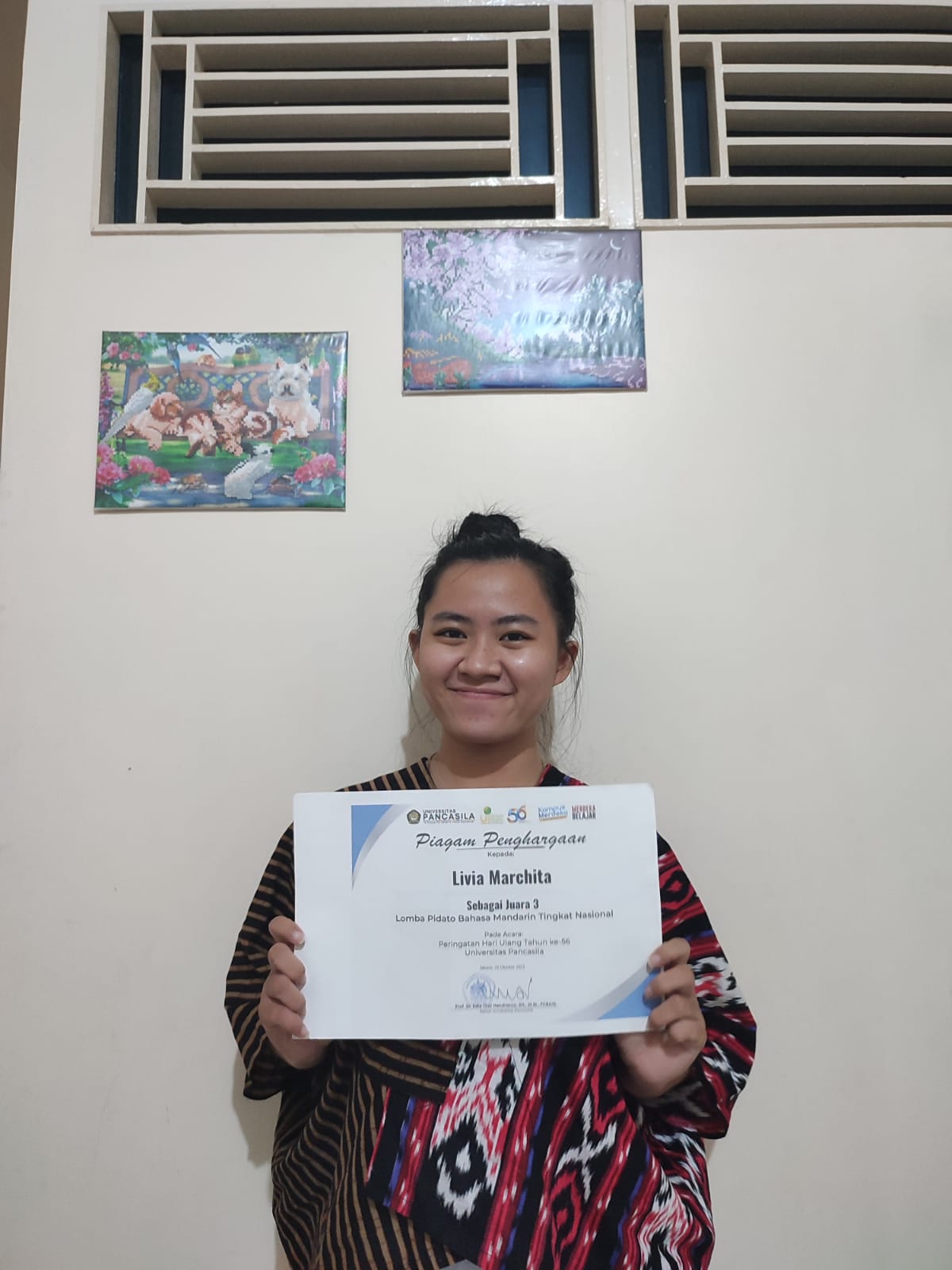 Lomba Pidato Virtual 5 Bahasa Asing (Arab, Inggris, Jepang, Korea, dan Mandarin) Tingkat Nasional dengan Tema “Unity in Diversity” jenjang SMA/SMK/MA & Mahasiswa/i (D3, D4 & S1) diselnggarakan oleh Universitas Pancasila dalam rangka Dies Natalis Universitas Pancasila ke 56. Livia Marchita NIM F1131191019 Prodi Pendidikan Bahasa Mandarin FKIP Universitas Tanjungpura Meraih Juara 3 Lomba Pidato Bahasa Mandarin.