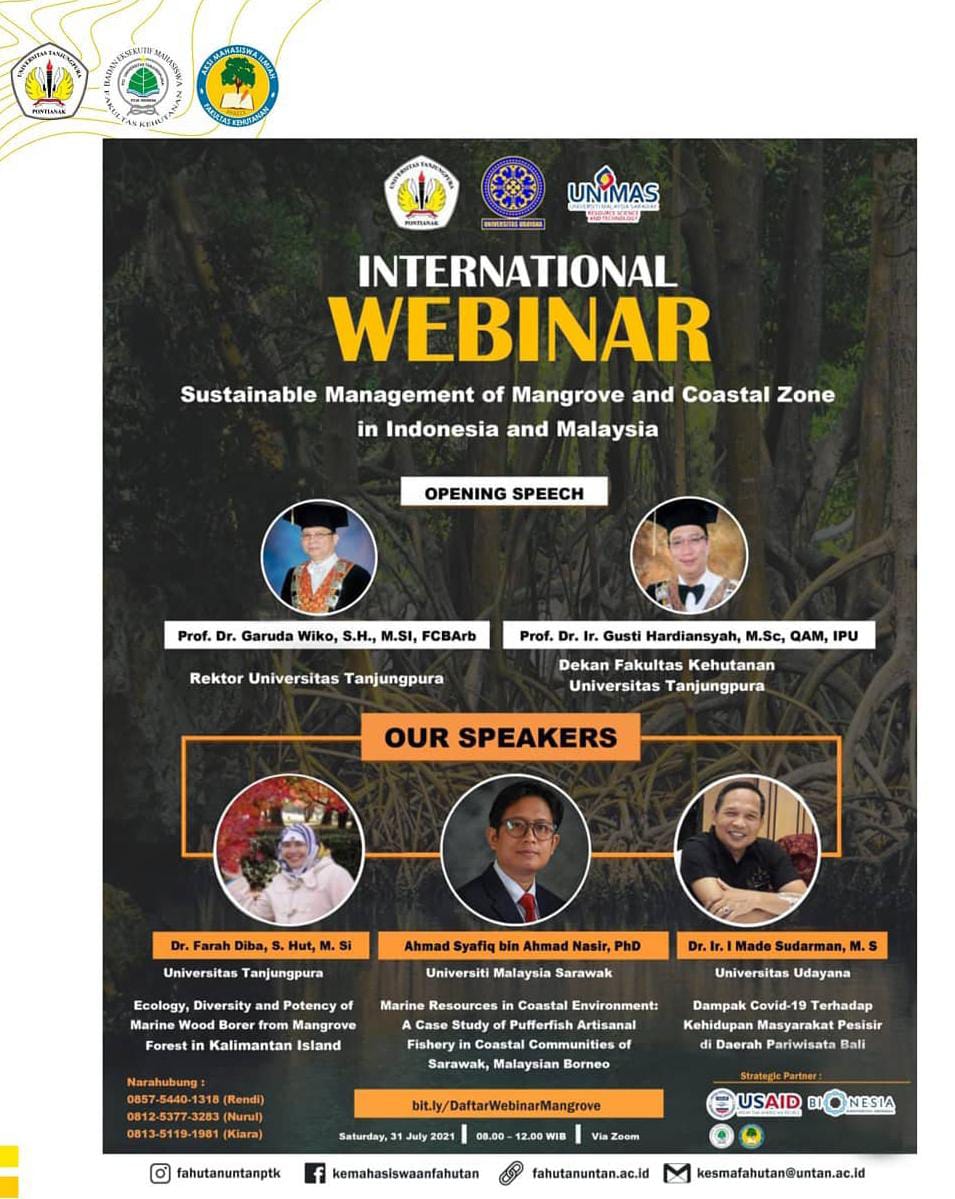 International Managing Mangrove For Coastal Protection merupakan sebuah kegiatan yang diselenggarakan oleh Universitas Tanjungpura, Universitas Udayana, dan Universiti Malaysia Sarawak. International Managing Mangrove For Coastal Protection merupakan suatu rangkaian kegiatan yang terdiri dari berbagai macam lomba dan webinar yang dilakukan secara daring. International Managing Mangrove For Coastal Protection hadir sebagai wadah dalam pengembangan diri yang ditujukan kepada mahasiswa Indonesia dan Malaysia dari berbagai perguruan tinggi untuk menuangkan ide maupun gagasannya dengan kreatif, inovatif, dan inspiratif dalam bentuk poster ilmiah, essay, dan video kreatif.