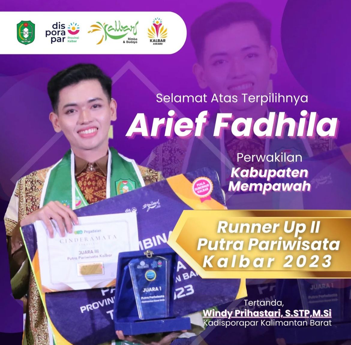 Pemenang Juara 3 atau Runner Up 2 Putra Pariwisata Kalimantan Barat Tahun 2023 adalah Arief Fadillah, mahasiswa Fakultas Teknik, Jurusan Perencanaan Wilayah dan Kota, Universitas Tanjungpura. Pemenang dianugerahi langsung oleh Kepala Dinas Pemuda Olahraga dan Pariwisata Provinsi Kalimantan Barat, Windy Prihastari, S.STP., M.Si.