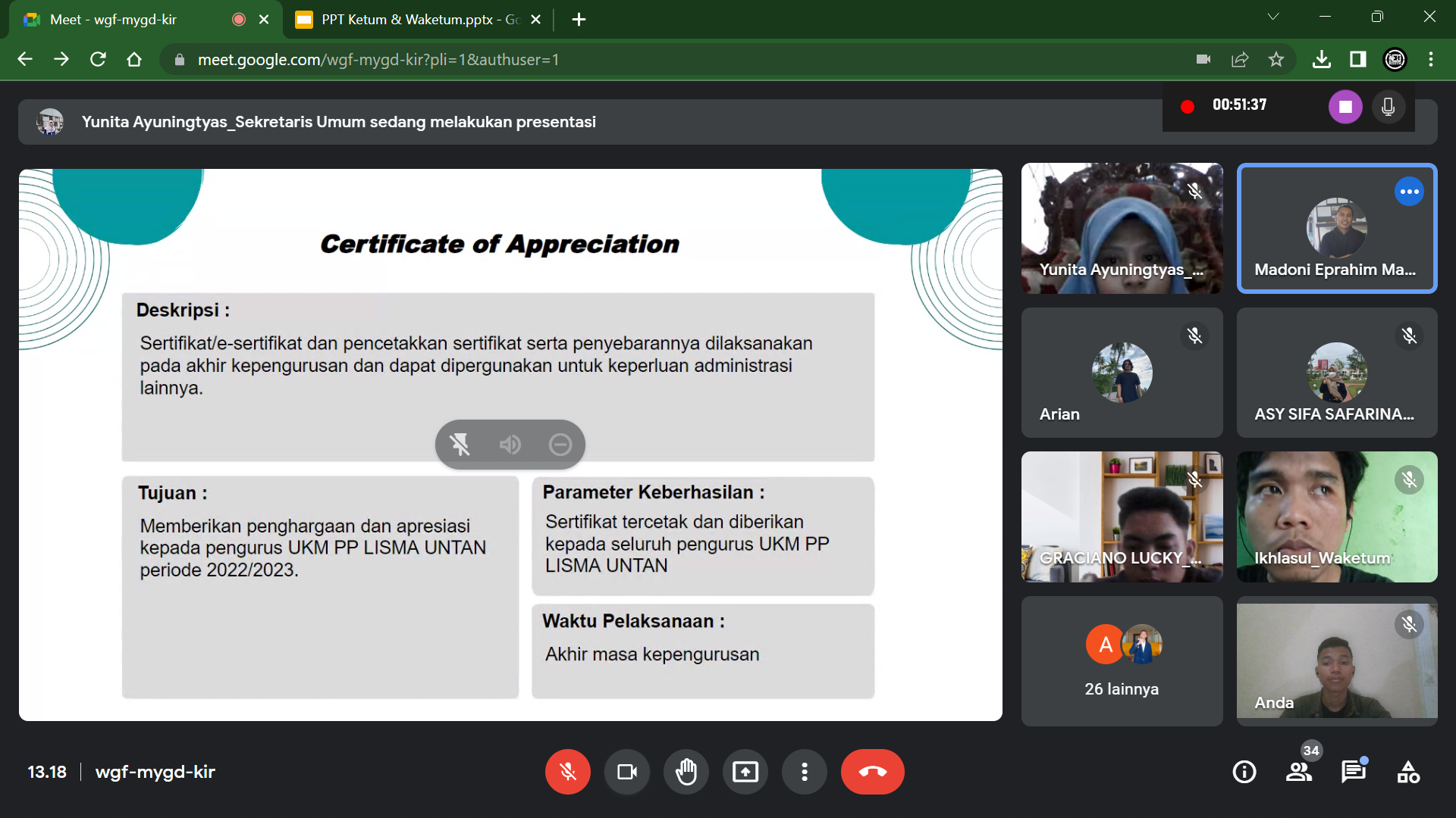 Kegiatan ini dilakukan secara daring menggunakan google meet untuk seluruh anggota, alumni dan pembina, serta dilakukan secara luring untuk pengurus harian (ketua, wakil, sekretaris, dan bendahara). Kegiatan ini dihadiri sebanyak 47 Pengurus UKM PP LISMA UNTAN sebagai peserta kegiatan.