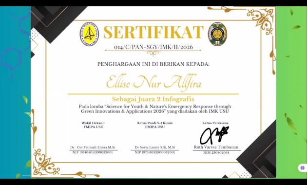 Kegiatan SYNERGIA (Science for Youth & Nature’s Emergency Response through Green Innovations & Applications) merupakan lomba esai dan infografis tingkat nasional yang diselenggarakan oleh Ikatan Mahasiswa Kimia FMIPA Universitas Sumatera Utara. Kegiatan ini menjadi wadah bagi mahasiswa dari berbagai perguruan tinggi di Indonesia untuk menyalurkan ide dan kreativitas dalam memberikan solusi terhadap berbagai permasalahan lingkungan melalui inovasi berbasis sains dan teknologi hijau.