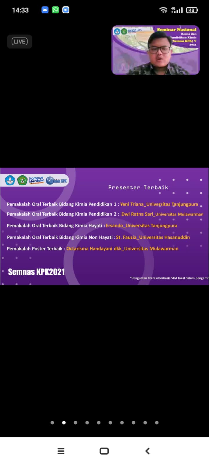 Seminar Nasional Kimia dan Pendidikan Kimia (Semnas KPK) tahun 2021 diselenggarakan oleh Program Studi S1 Pendidikan Kimia Fakultas Keguruan dan Ilmu Pendidikan Universitas Mulawarman. Seminar Nasional Kimia dan Pendidikan Kimia ini rutin dilaksanakan setiap tahun dan saat ini merupakan pelaksanaan ke lima dan dilaksanakan secara daring (online) dengan tema “Penguatan literasi berbasis sumber daya alam lokal dalam pengembangan riset kimia dan pendidikan kimia untuk mendukung merdeka belajar”. Seminar nasional KPK ini mencakup seluruh bidang ilmu kimia, pendidikan kimia dan ilmu terkait lainnya.