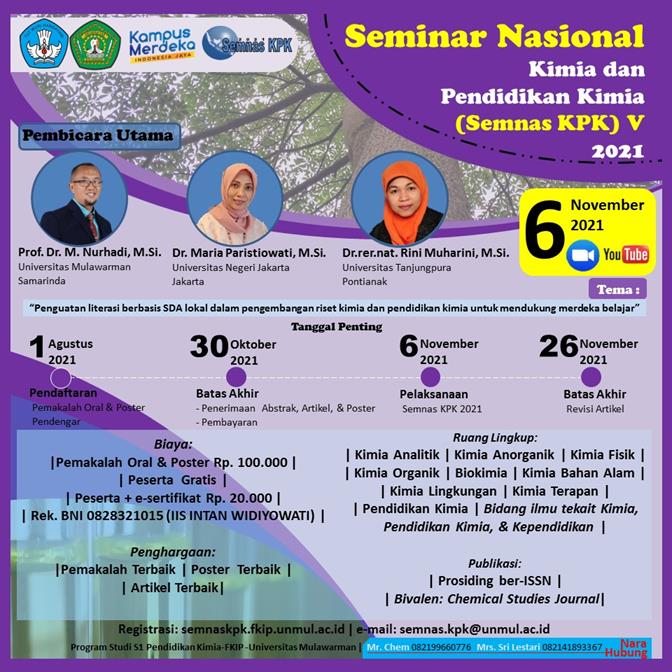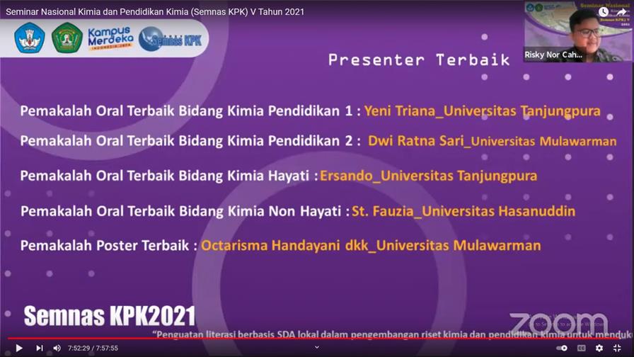 Seminar Nasional Kimia dan Pendidikan Kimia (Semnas KPK) tahun 2021 diselenggarakan oleh Program Studi S1 Pendidikan Kimia Fakultas Keguruan dan Ilmu Pendidikan Universitas Mulawarman. Seminar Nasional Kimia dan Pendidikan Kimia ini rutin dilaksanakan setiap tahun dan saat ini merupakan pelaksanaan ke lima dan dilaksanakan secara daring (online) dengan tema “Penguatan literasi berbasis sumber daya alam lokal dalam pengembangan riset kimia dan pendidikan kimia untuk mendukung merdeka belajar”. Seminar nasional KPK ini mencakup seluruh bidang ilmu kimia, pendidikan kimia dan ilmu terkait lainnya. Yeni Triana F1061171048 Pemakalah Oral Terbaik Bidang Kimia Pendidikan 1