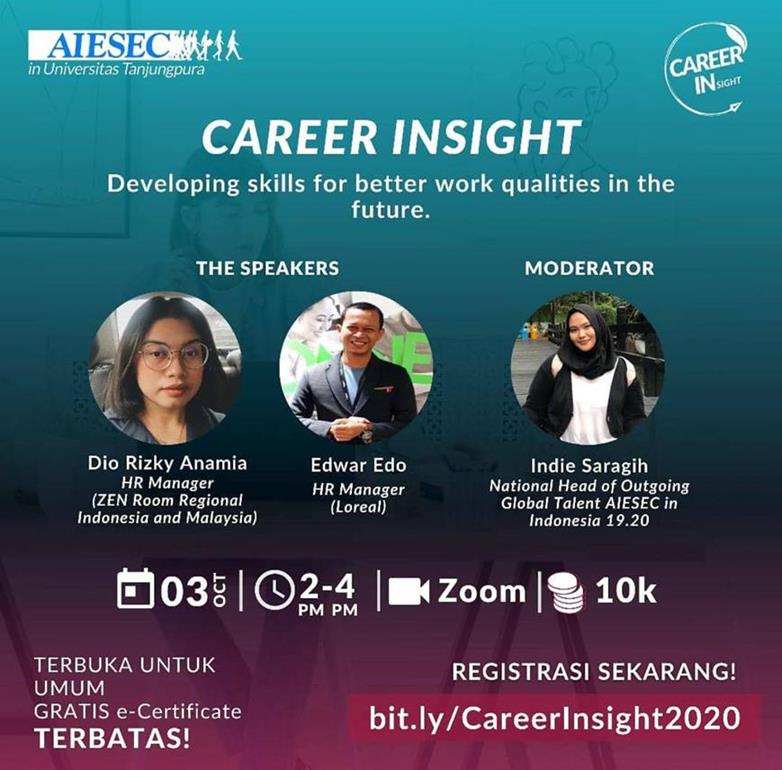 Webinar nasional: Career Insight 2020 “Developing skills for better work qualities in the future” merupakan suatu kegiatan yang diadakan oleh AIESEC in UNTAN. Career Insight adalah webinar yang menjadi wadah bagi mahasiswa dan fresh graduate untuk lebih memahami hal-hal yang akan mereka temukan di dunia kerja dengan memberikan tips bagaimana dan di mana mereka bisa mendapatkan pengembangan diri dari pengalaman kerja dengan melakukan magang di Program Global Talent. Webinar ini diselenggarakan pada tanggal 3 Oktober 2020 menggunakan Zoom Meeting dengan pembicara yaitu Dio Rizky Anamia sebagai HR Manager di ZEN Room Regional Indonesia & Malaysia, Edwar Edo sebagai HR Manager di Loreal, serta Indie Saragih sebagai National Head of Outgoing Global Talent AIESEC in Indonesia. Webinar ini diikuti sebanyak 100+ peserta.