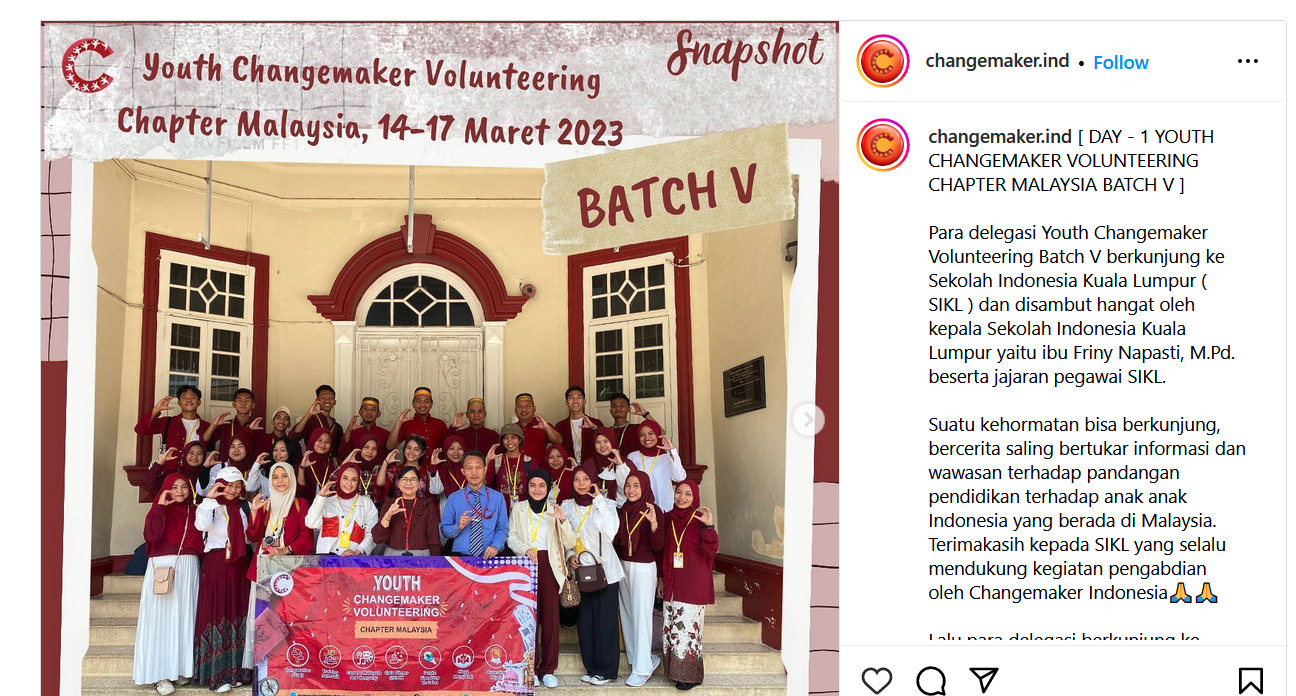 Seleksi Youth Changemaker Symposium Conference Chapter Malaysia Batch V 2023 diadakan secara online dalam skala International. Dari berbagai tahapan seleksi yang dilalui tersebut, terpilihlah 20 pemuda pemudi terbaik bangsa yang kemudian akan menjadi perwakilan Indonesia untuk melakukan program studi banding selama kurang lebih 5 hari di Kuala Lumpur, Malaysia pada tanggal 13 – 17 Maret 2023.